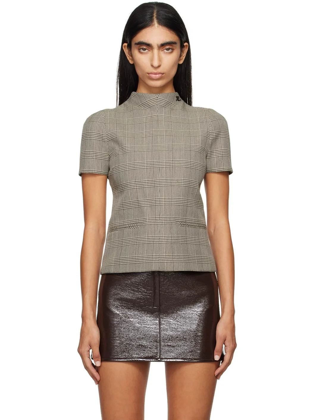 Wool- and polyester-blend twill top. Jacquard Prince of Wales pattern throughout. · Logo patch at mock neck · Welt pockets · Cap sleeves · Zip closure at back · Full cupro satin lining Supplier color: Sand/Mud brown Body: 54% wool, 46% polyester. Lining: 100% cupro. Made in Serbia 242783F110011