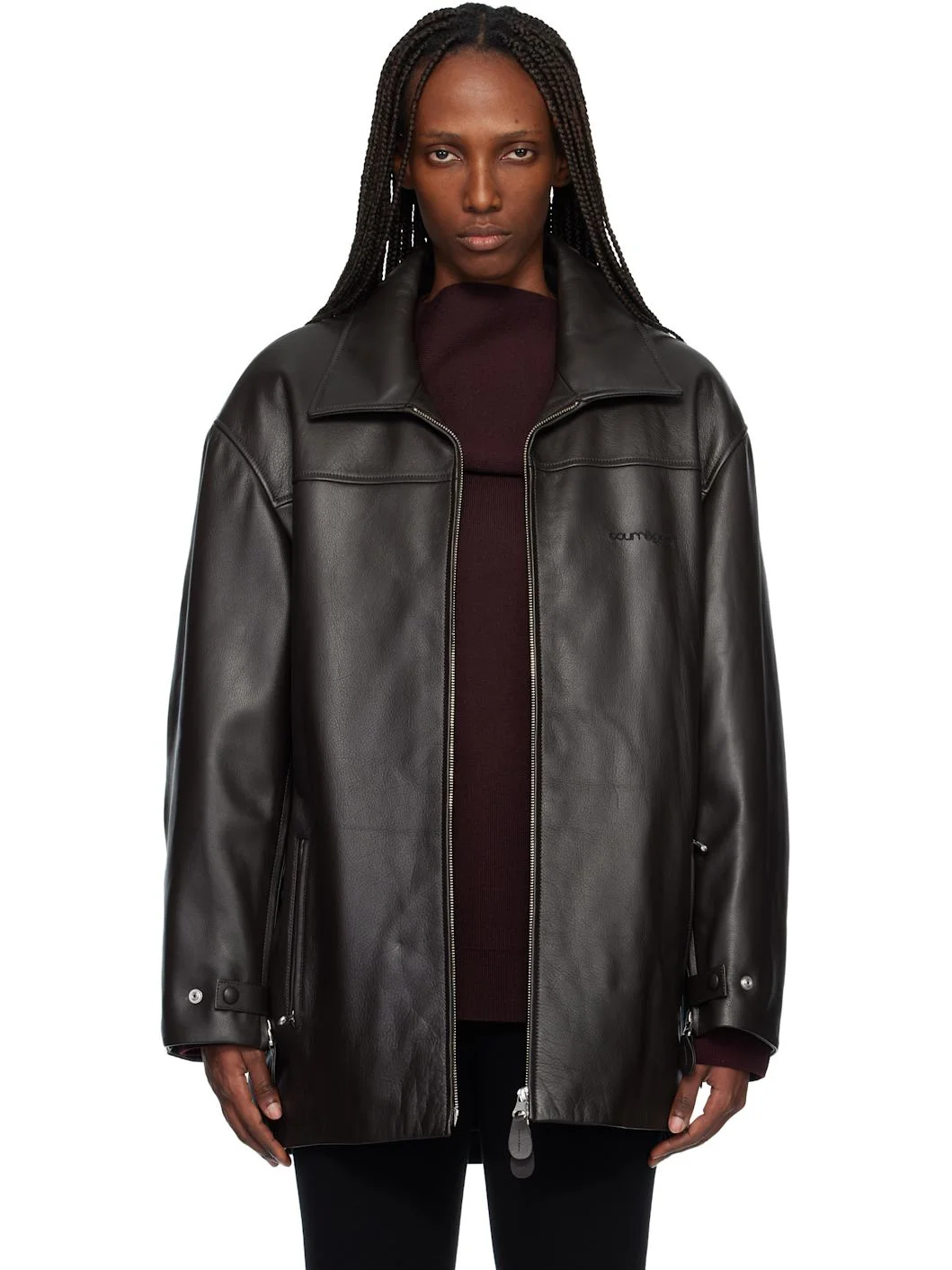 Padded grained leather jacket. · Spread collar · Two-way zip closure · Logo embroidered at chest · Zip pockets at waist · Dropped shoulders · Logo embroidered at back collar · Belt loops and detachable belt at back waist · Welt pocket at interior · Full satin lining Supplier color: Dark brown Body: 100% leather. Fill: 100% polyester. Lining: 100% viscose. Made in Turkey 252783F064004