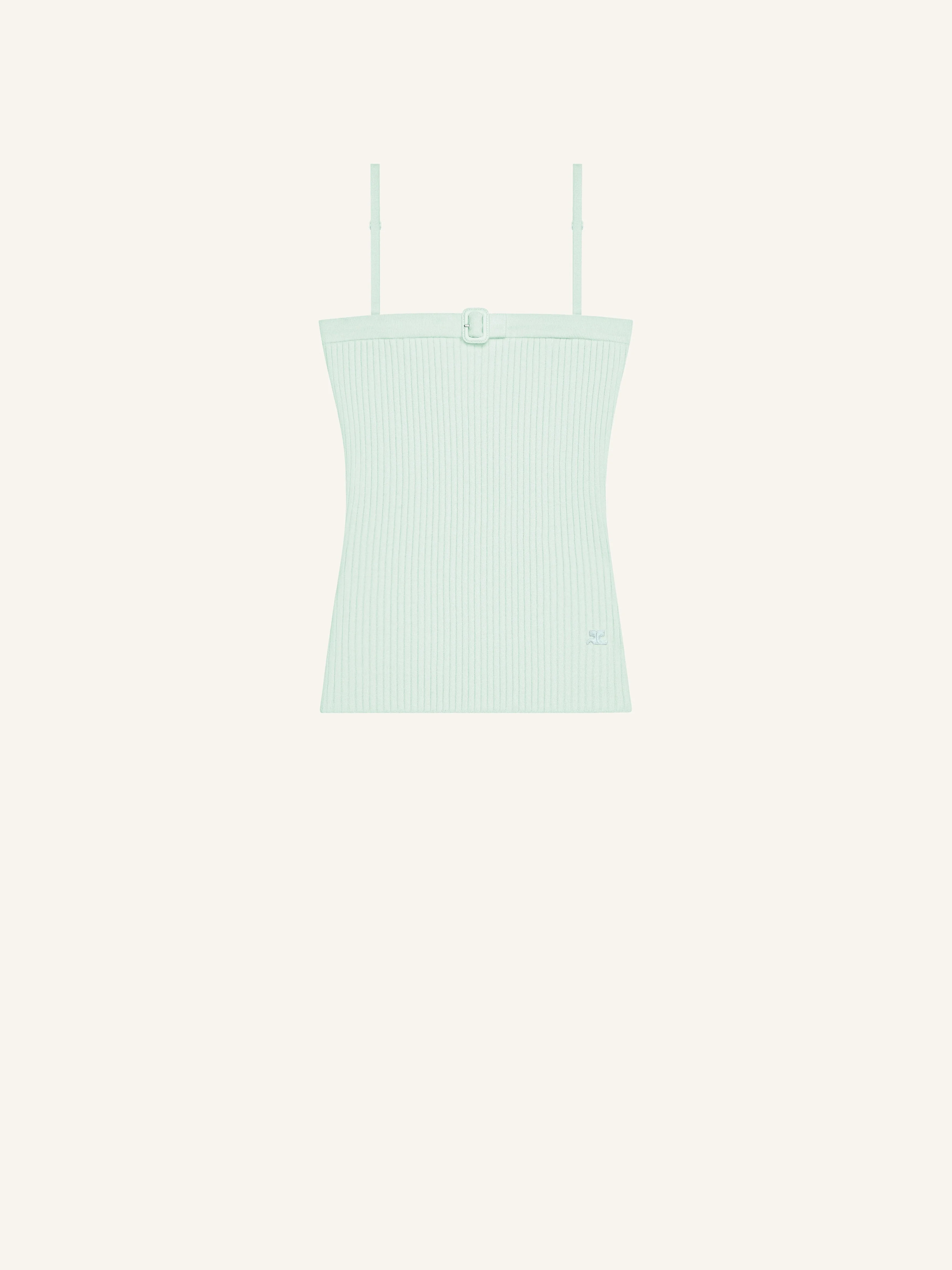 Rib knit top with buckle detail on the chest and embroidered AC logo on the bottom. Thin adjustable and removable straps. DETAILS Composition: 70% viscose , 30% polyester Country of Manufacture: BG SKU: 126MDE156FI00017038 Color: Light mint
