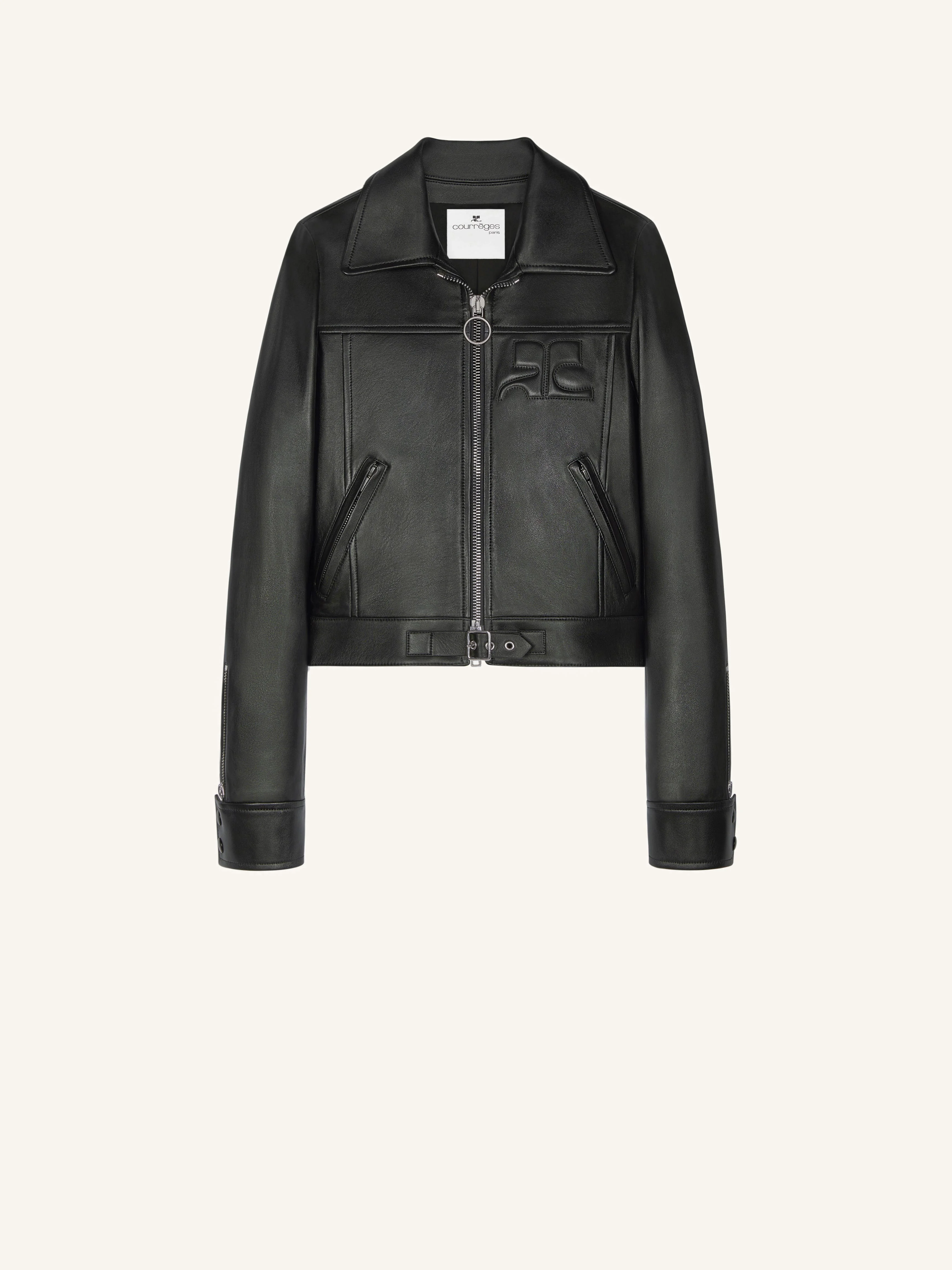 Straight leather jacket with long sleeves and zipped pockets. AC logo on chest and waist strap. The model is 1.78m tall and wears a size 36. DETAILS Composition: 100% lamb skin Country of Manufacture: TR SKU: VESLBL149CV00059999 Color: Black