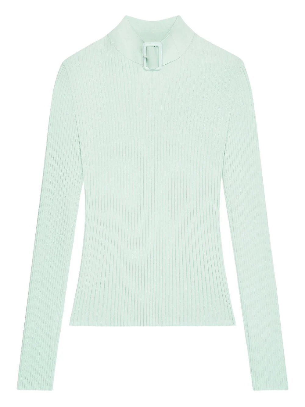 buckle-neck ribbed sweater Highlights - Light mint - Ribbed knit - High neck - Buckle detail - Long sleeves Imported Composition Outer: Viscose 70%, Polyester 30% Washing instructions Read Manufacturer Guidelines