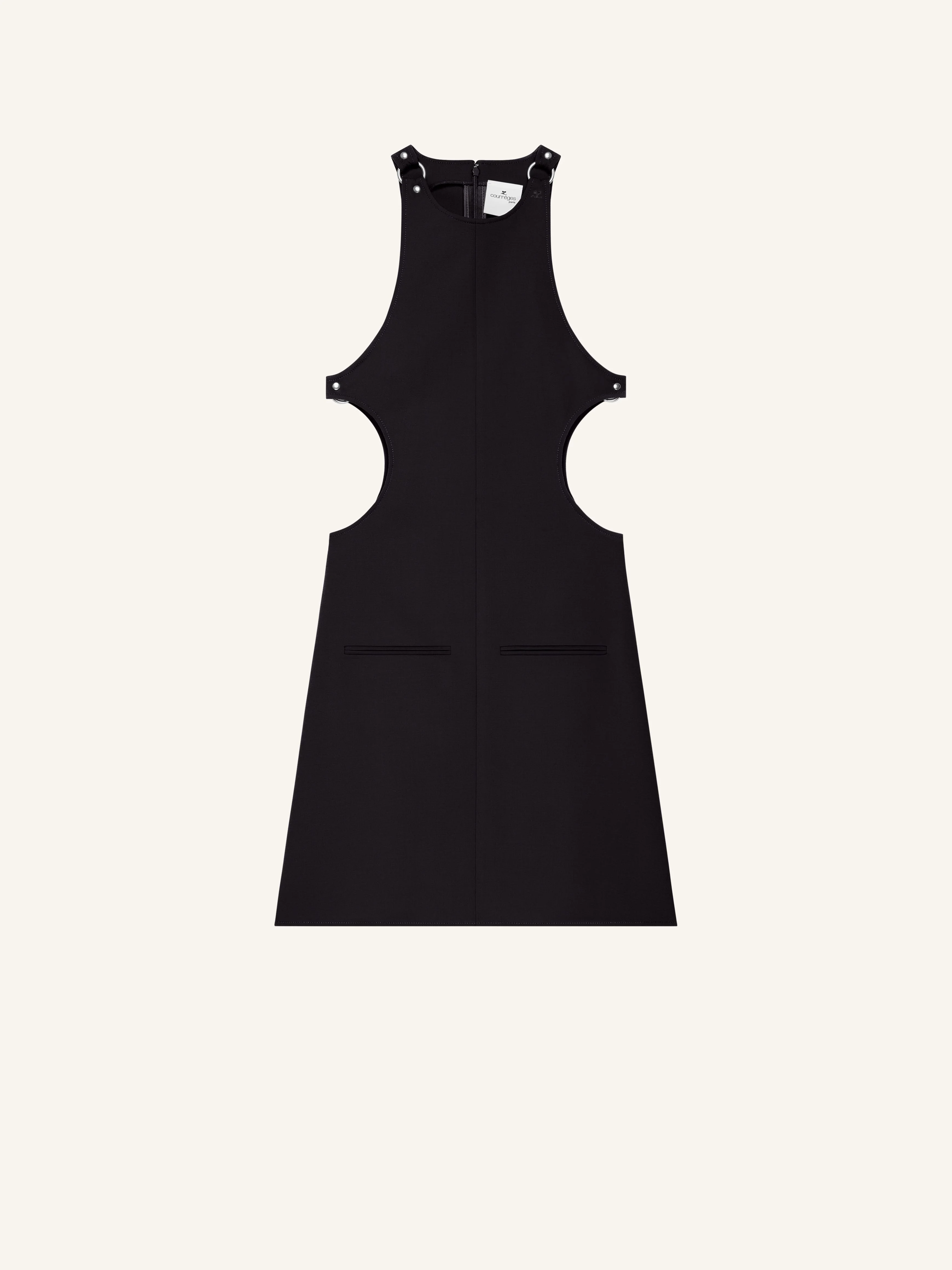 Sleeveless A-line wool dress with buckle details on straps and sides. Two front welt pockets and cut-outs on sides. The model is 1.77m tall and wears a size 36. DETAILS Composition: 93% wool, 4% elastane, 3% polyamide Country of Manufacture: RO SKU: 325CRO687WO01139999 Color: Black