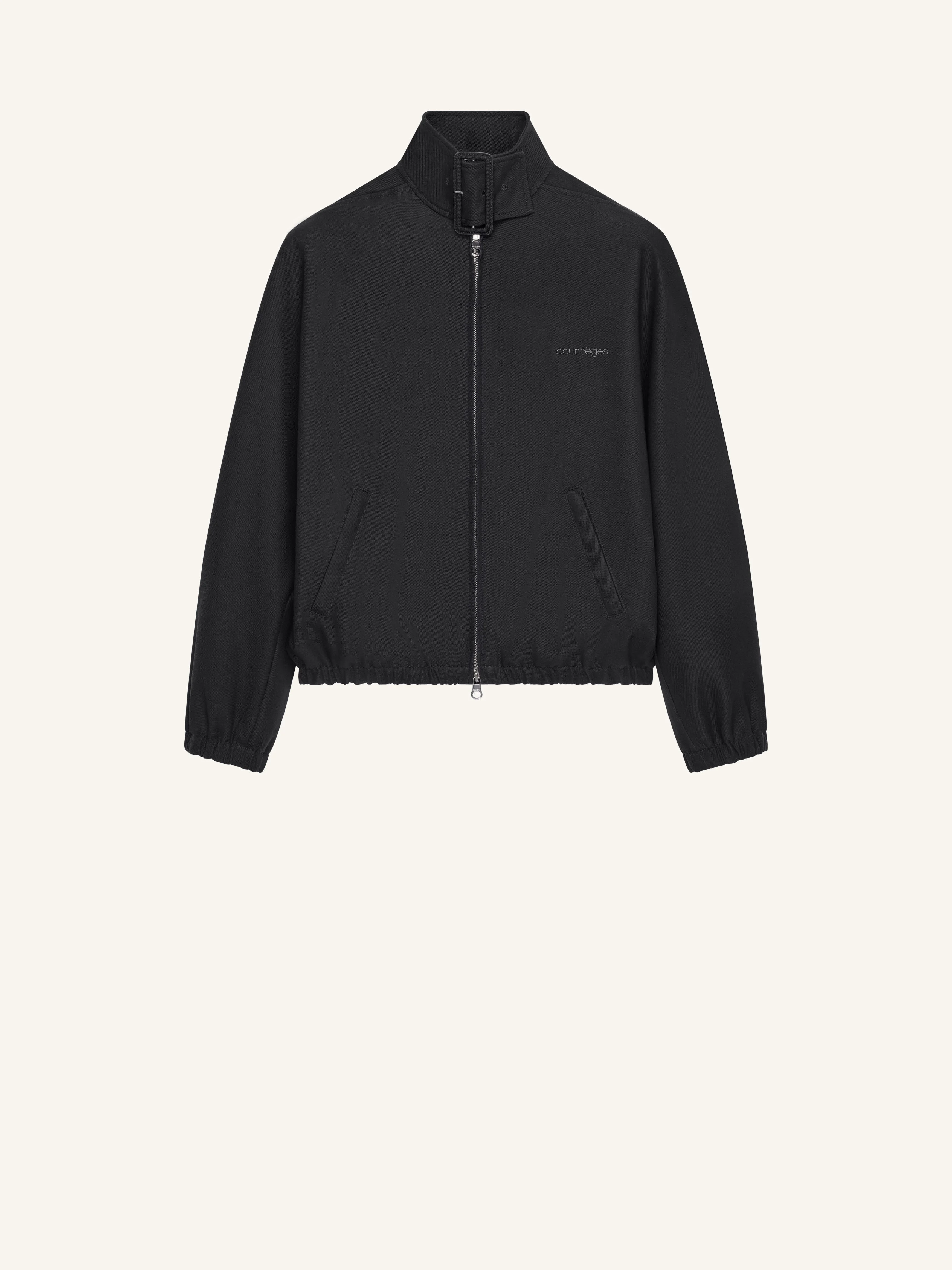 Zipped cotton bomber jacket with adjustable buckle at the collar and side pockets. Embroidered "Courreges" logo on chest, elasticated waist and sleeves. The model is 1.80m and wears a size S. DETAILS Composition: 100% cotton Country of Manufacture: LT SKU: 126CBL334CO01349999 Color: Black