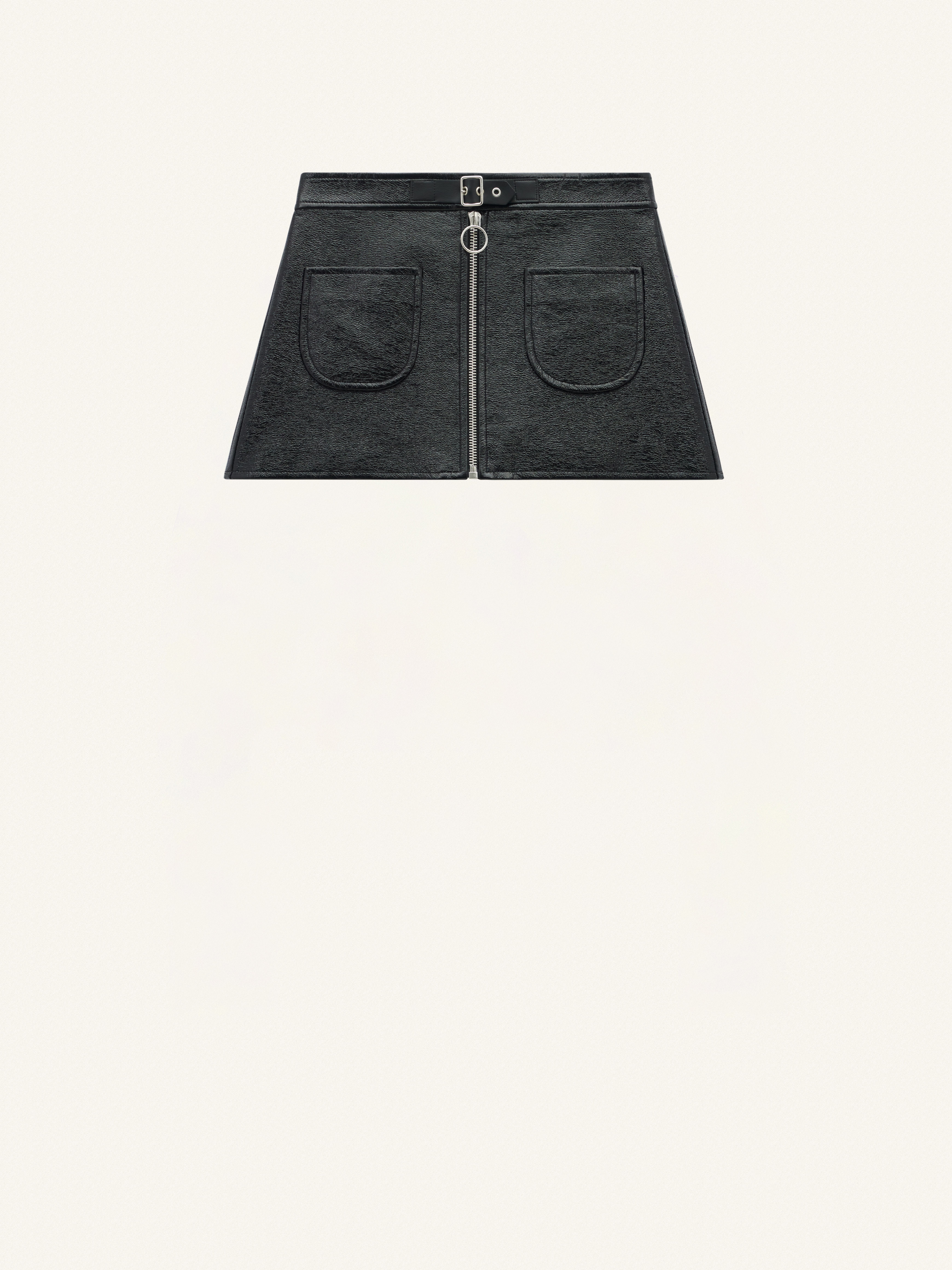 This leather mini skirt has two patch pockets, a big middle zipper and a buckle belt. DETAILS Composition : 88% Coton, 10% Polyuréthane 2% Elasthanne Pays de fabrication : Portugal Couleur : Noir Code Article : 124CJU154VY0014