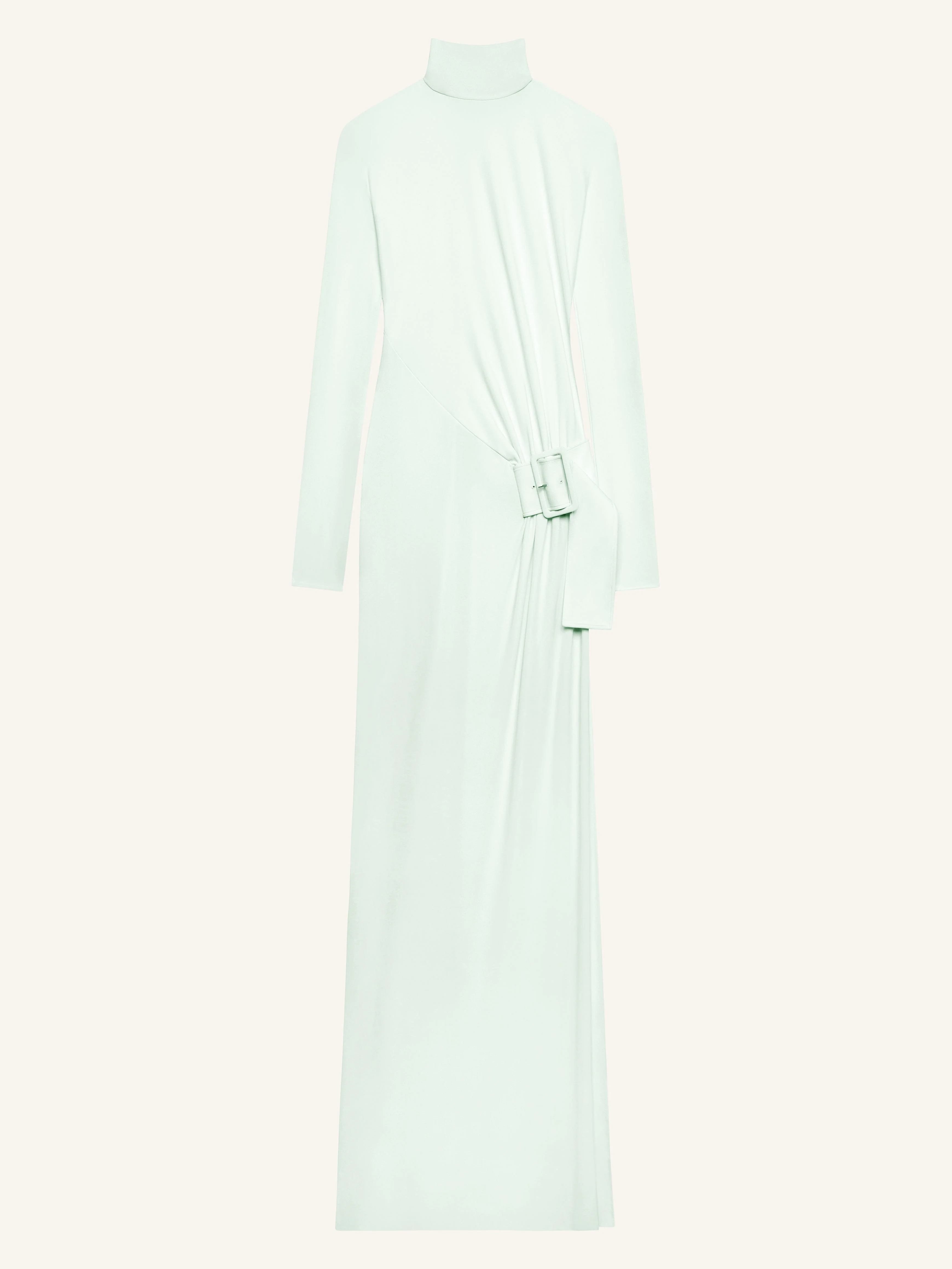 Long mockneck jersey dress with side slit and adjustable buckle at the hip. The model is 1.79m and wears a size 36. DETAILS Composition: 95% viscose , 5% elastane Country of Manufacture: MG SKU: 126JRO811JS01457038 Color: Light mint