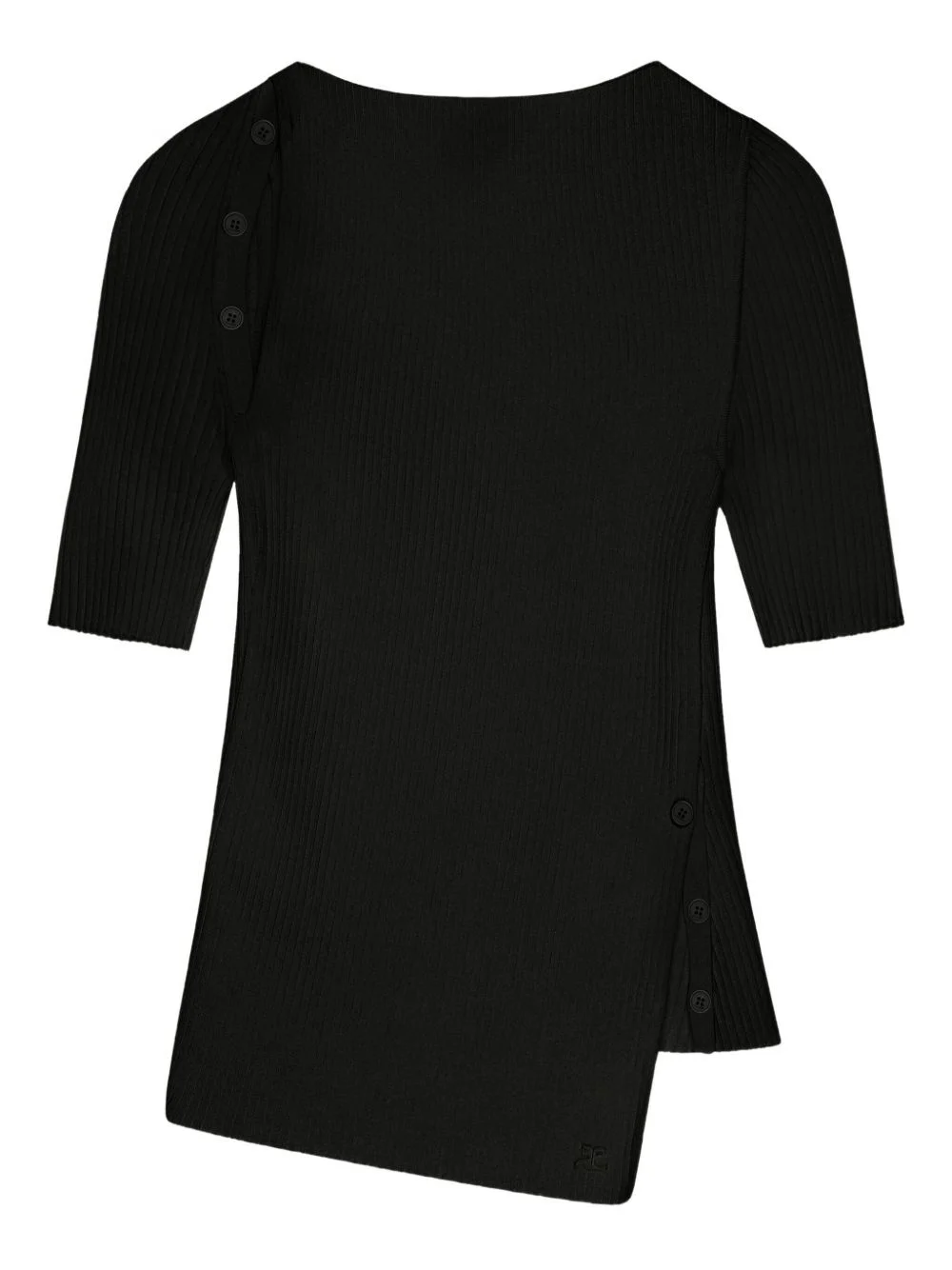 buttoned ribbed top Highlights - Black - Ribbed texture - Short sleeves - Asymmetrical hem - Button fastening Imported Composition Viscose 70%, Polyester 30% Washing instructions Read Manufacturer Guidelines
