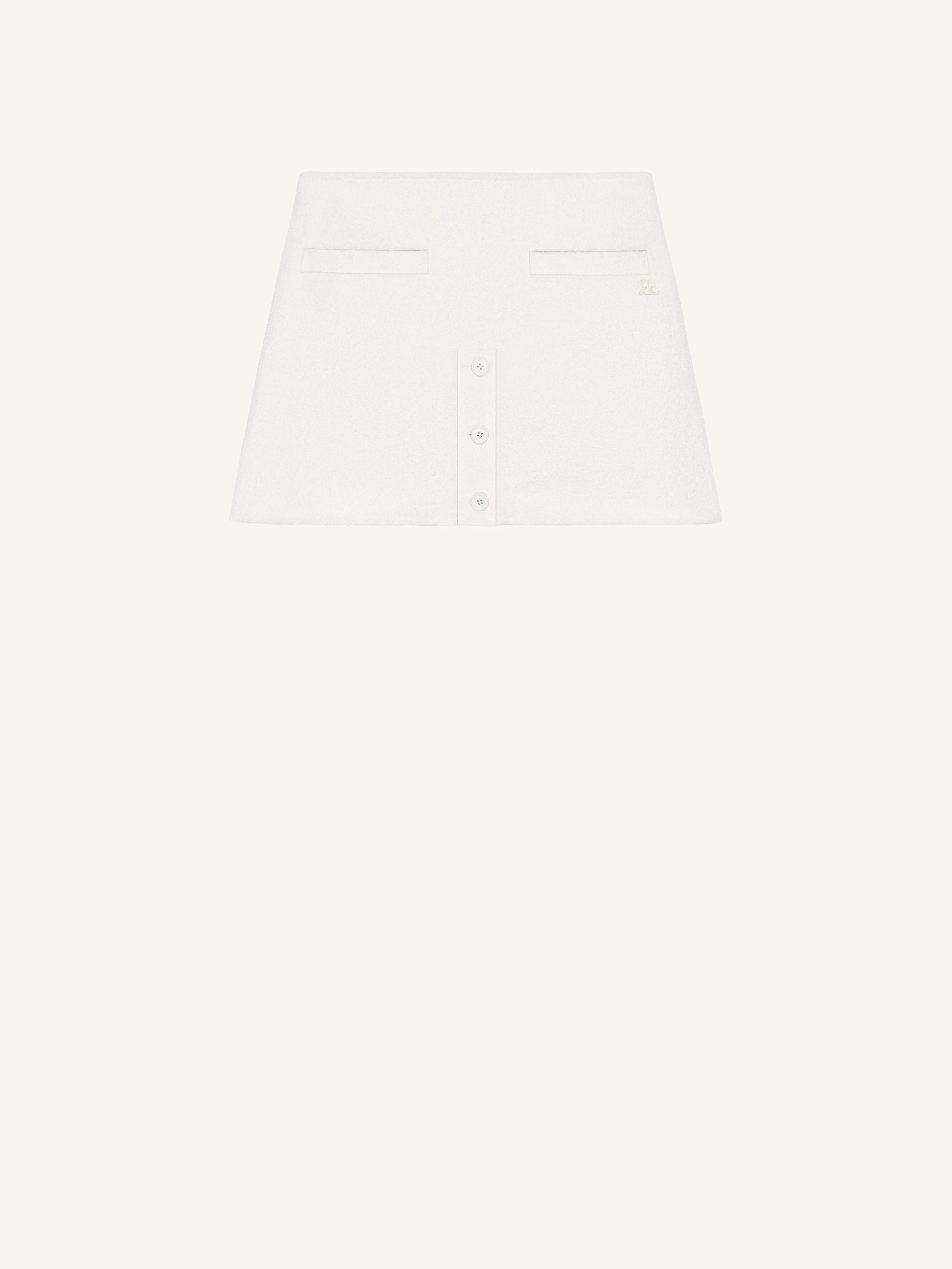 Mini tweed skirt with buttoned slit at the front and two welt pockets. Embroidered AC logo on the side. The model is 1.79m and wears a size 36. DETAILS Composition: 60% polyester , 33% cotton , 7% others Country of Manufacture: PT SKU: 126CJU330PL02600001 Color: Heritage White