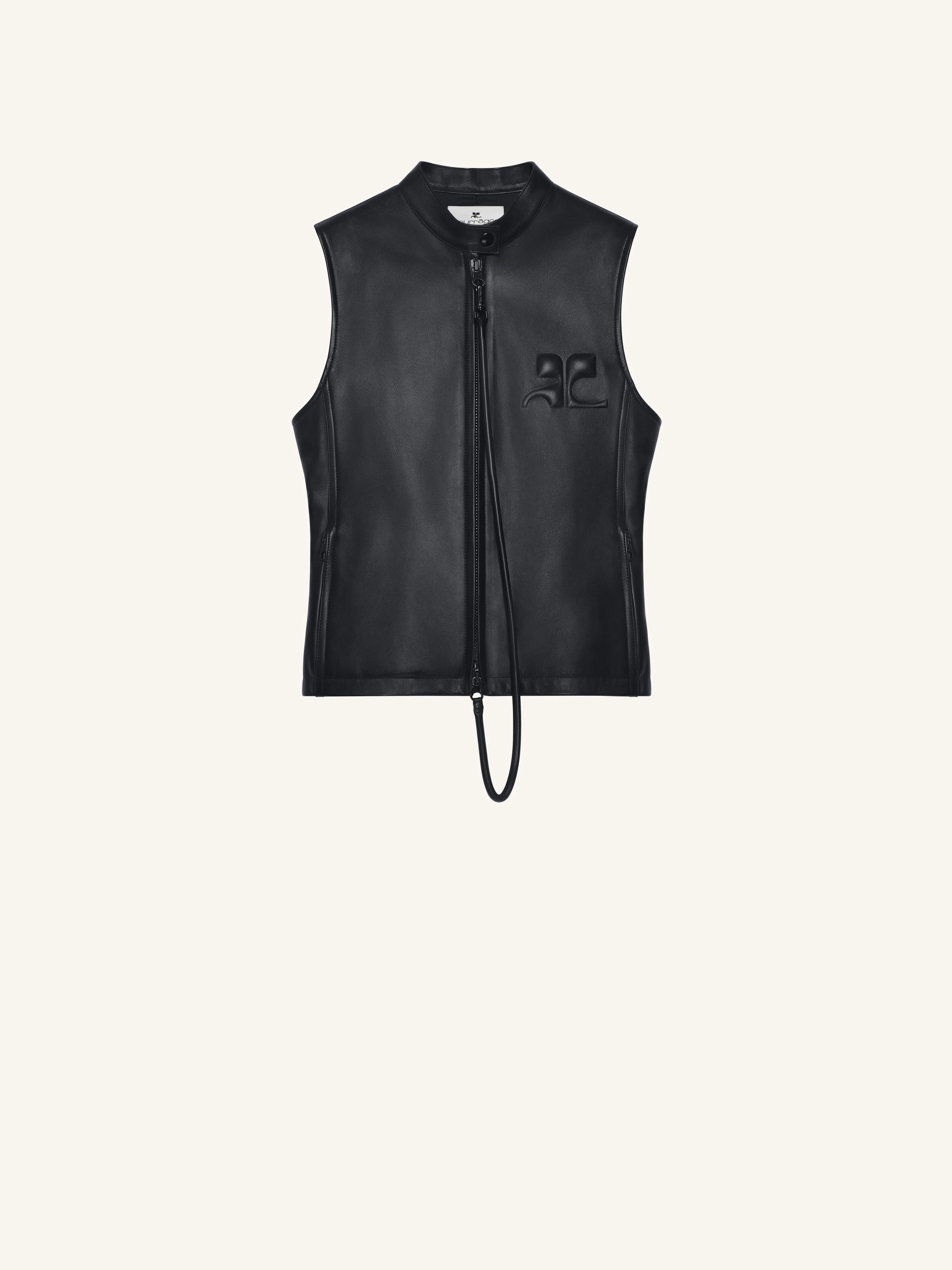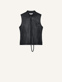 Sleeveless city style leather vest with shadow AC logo on the front. Detachable wire and two snaps at collar. The model is 1.77m tall and wears a size 36. DETAILS Composition: 100% lamb leather Country of Manufacture: FR SKU: 225LBL284AG00379999 Color: Black