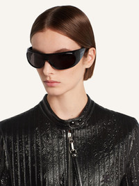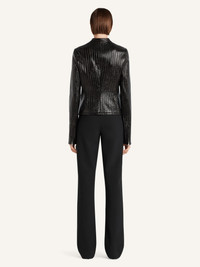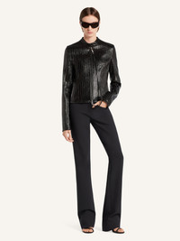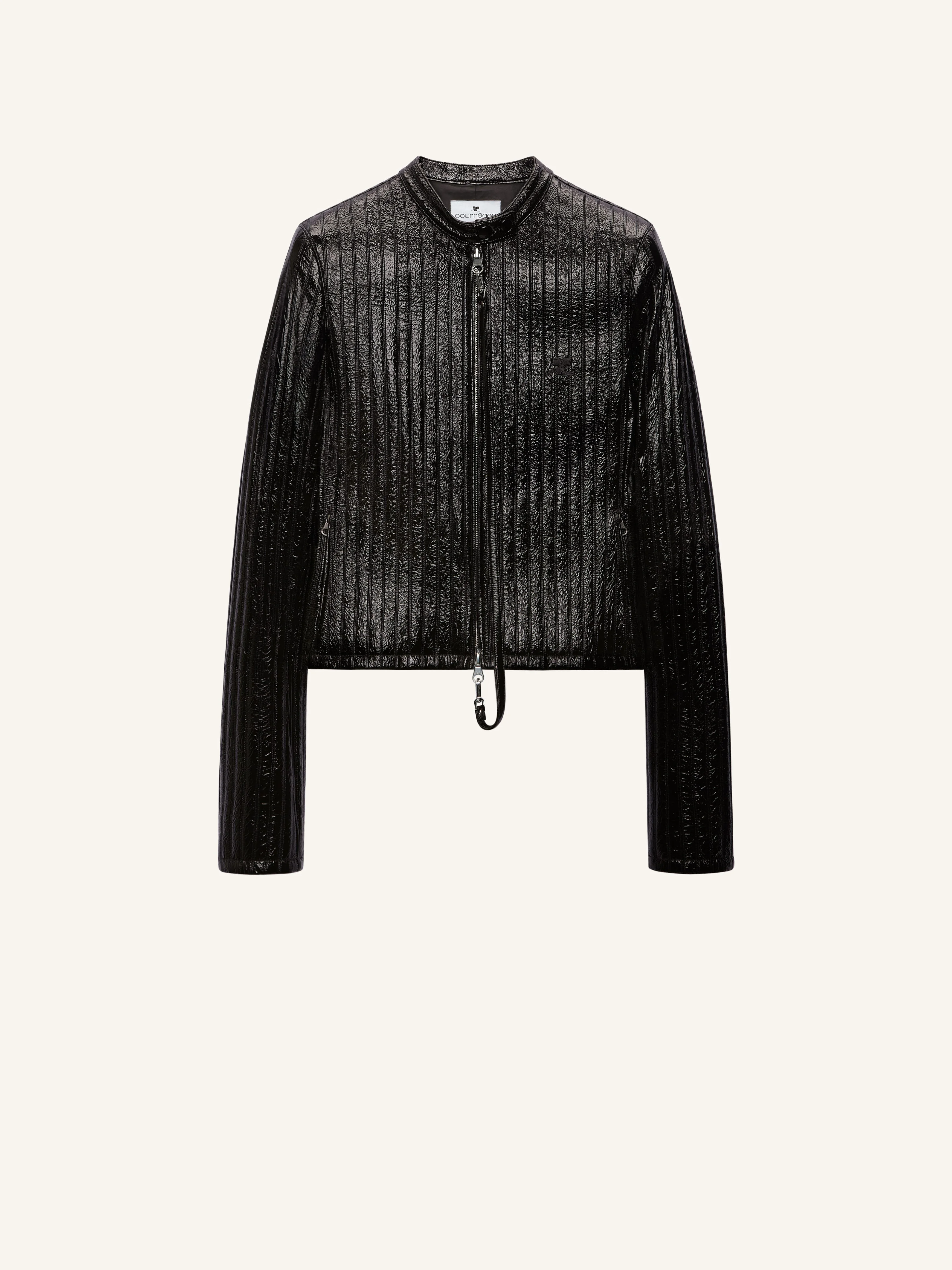 City style embroidered striped vinyl jacket with embroidered AC logo on the front. Vinyl detachable wire with "Courreges" snap hook and adjustable snaps at collar. The model is 1.74m tall and wears a size 36. DETAILS Composition: 88% cotton, 10% polyurethane, 2% elastane Country of Manufacture: SK SKU: 325CBL312VY00299999 Color: Black