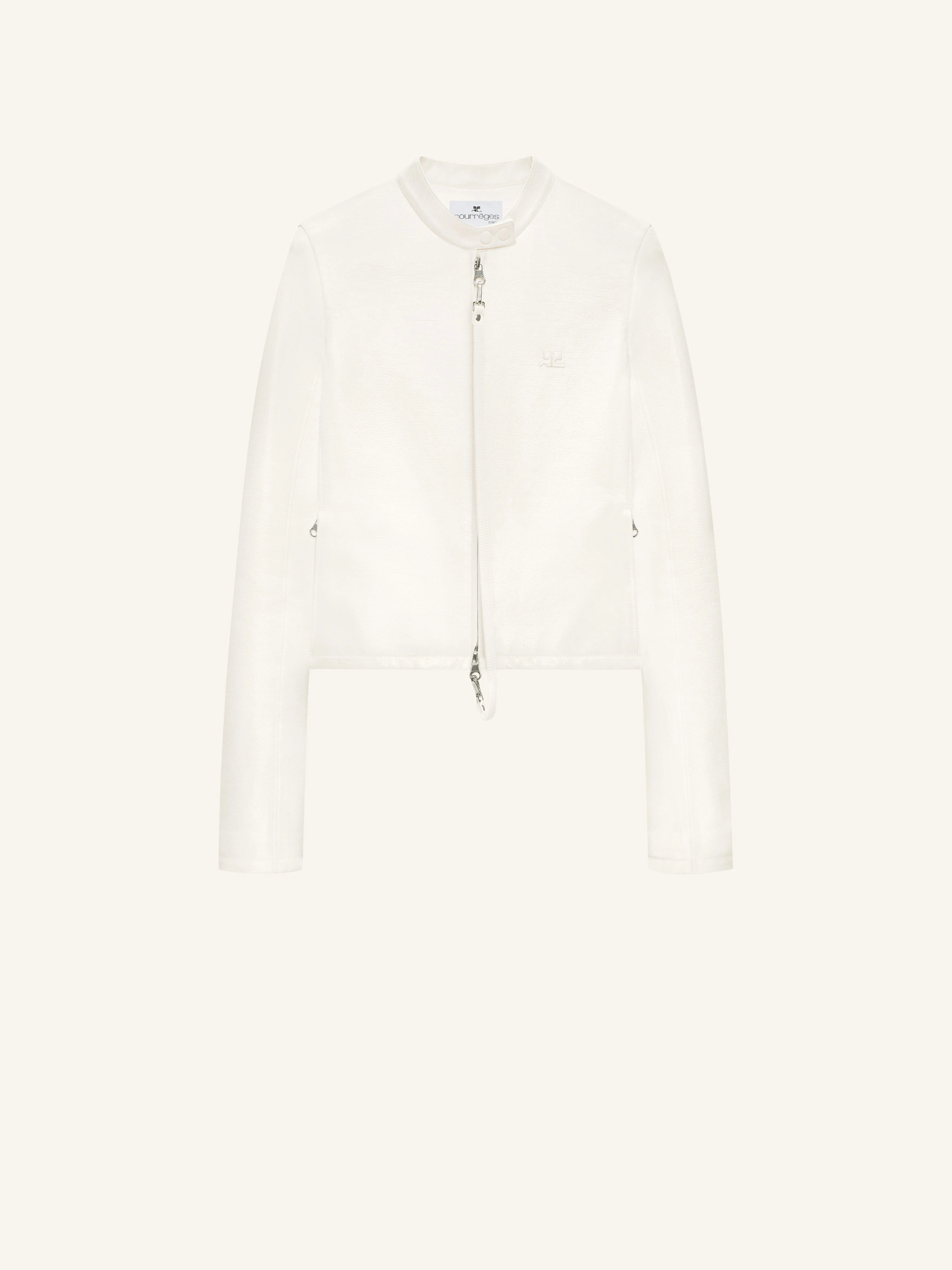City style vinyl jacket with embroidered AC logo on the front. Vinyl detachable wire with "Courreges" snap hook and adjustable snaps at collar. The model is 1.74m tall and wears a size 36. DETAILS Composition: 88% cotton, 10% polyurethane, 2% elastane Country of Manufacture: SK SKU: 325CBL293VY00140001 Color: Heritage White