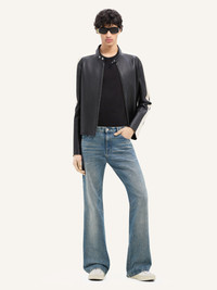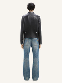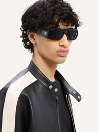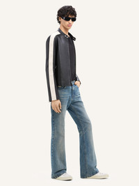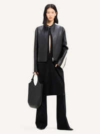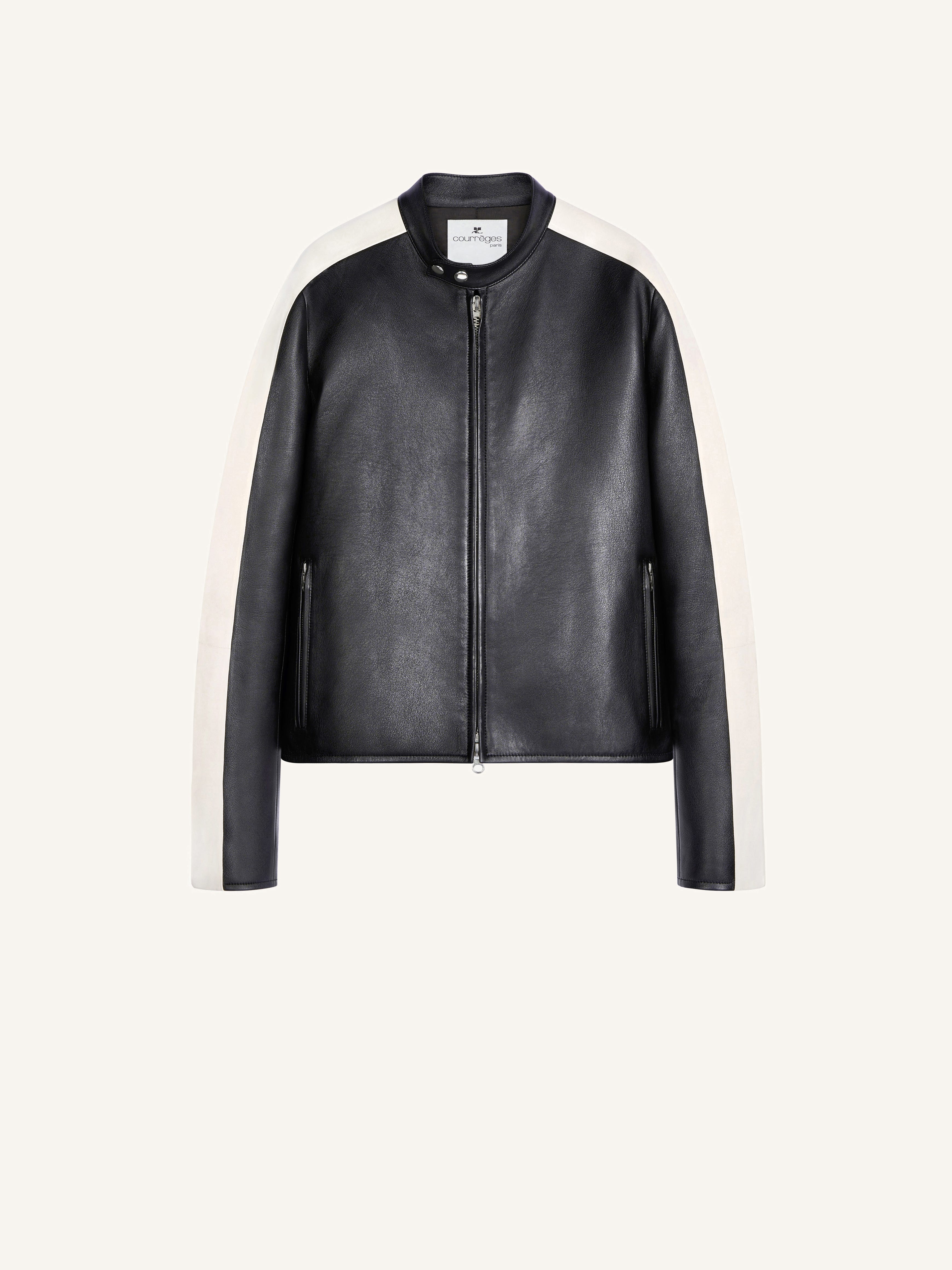 Biker leather jacket with a white stripe along the sleeves. Metal zipped side pockets. Two-way metal zipper at center front and AC logo on chest. This item is unisex. The model is 1.78 m tall and the male mode is 1.85 m tall, both wearing a size 48. DETAILS Composition: 100% lamb skin Country of Manufacture: TR SKU: 324LBL199CV00059999 Color: Black