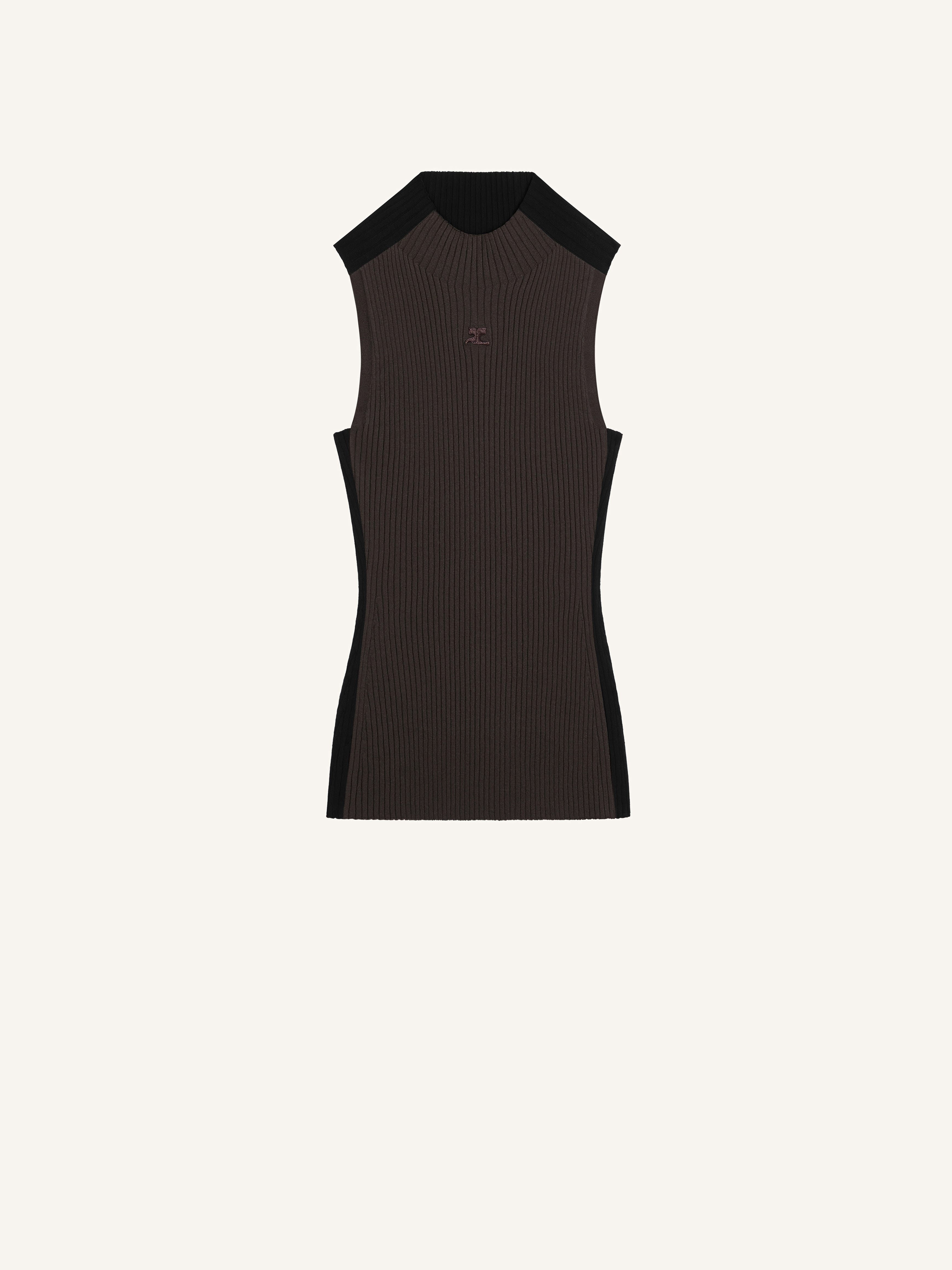 Contrast frame sleeveless rib knit top. Stand-up collar and AC logo centered on the chest. The model is 1.78m tall and wears a size S. DETAILS Composition: 70% viscose, 30% polyester Country of Manufacture: BG SKU: 324MTO336FI0001B118 Color: Mud Brown / Black