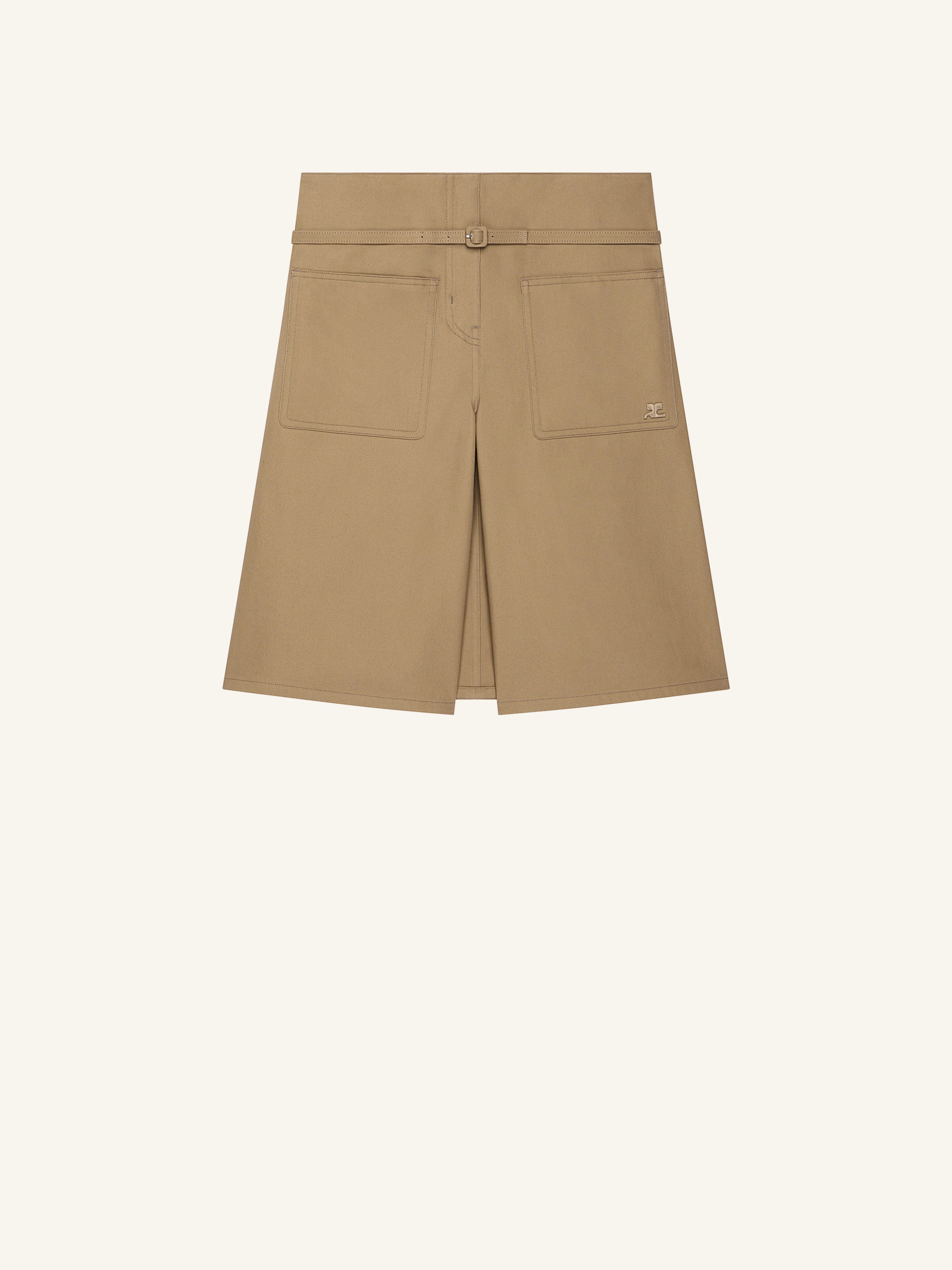 Cotton bermuda shorts with skirt-effect back panel and four patch pockets. Adjustable leather belt and ‘Courreges’ logo on jacron label at the back. Embroidered AC logo on front pocket. The model is 1.79m and wears a size 36. DETAILS Composition: 100% cotton Country of Manufacture: RO SKU: 226CSH081CO01341118 Color: Dark Sand