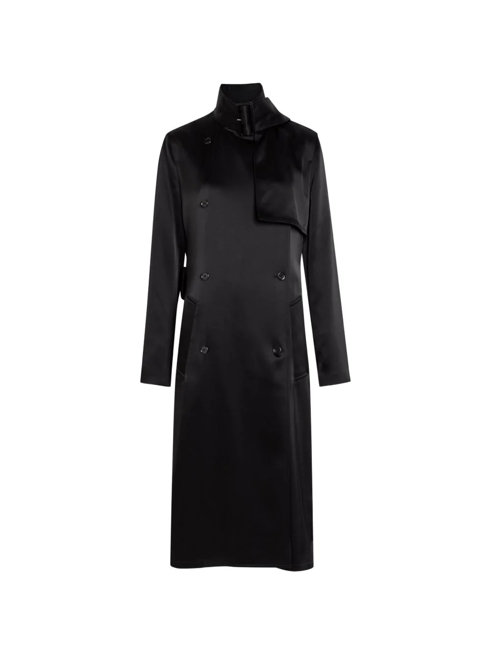 Double-breasted satin trench coat Highlights - Black - Button fastening - Front flap pocket - Long sleeves - Buckle collar - Double-breasted design Imported Composition Outer: Triacetate 83%, Polyester 17% Lining: Viscose 100% Washing instructions Dry Clean Only