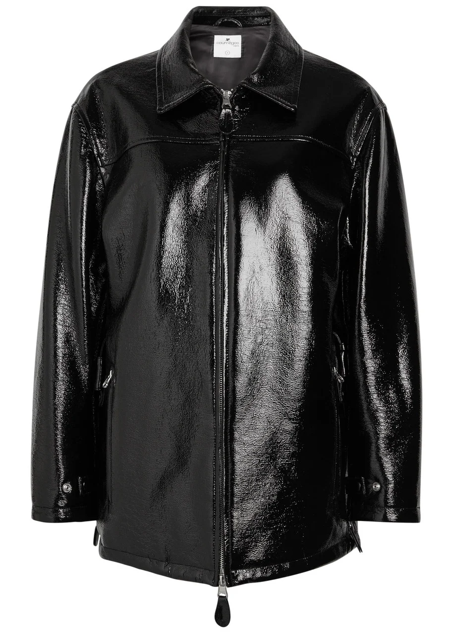 Info & Care Courreges faux patent leather jacket Quilted, adjustable press-stud fastening cuffs with zip-fastening split, press-stud fastening belt loops, zip-fastening front slit pockets, detachable press-stud fastening waist tab at back, crinkled finish, fully lined Two way zip fastening trough front 88% cotton, 10% polyurethane, 2% elastane; lining: 100% cupro; filling: 100% polyester Spot clean Size & Fit Length shoulder to hem: 29 inches/ 73.5cm Midweight Boxy;fit, straight cut Model is 5'9"/ 175cm and wears a size small;