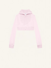This tracksuit cropped jacket in jersey fabric has a high ribs collar detail. DETAILS Composition: 100% Polyestser (Fabric 2: 99% Polyester 1% Elastic) Made in: Portugal Color: Powder Pink Code Article : 423JVE059JS0091