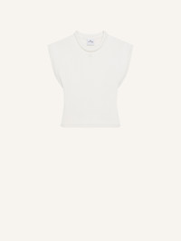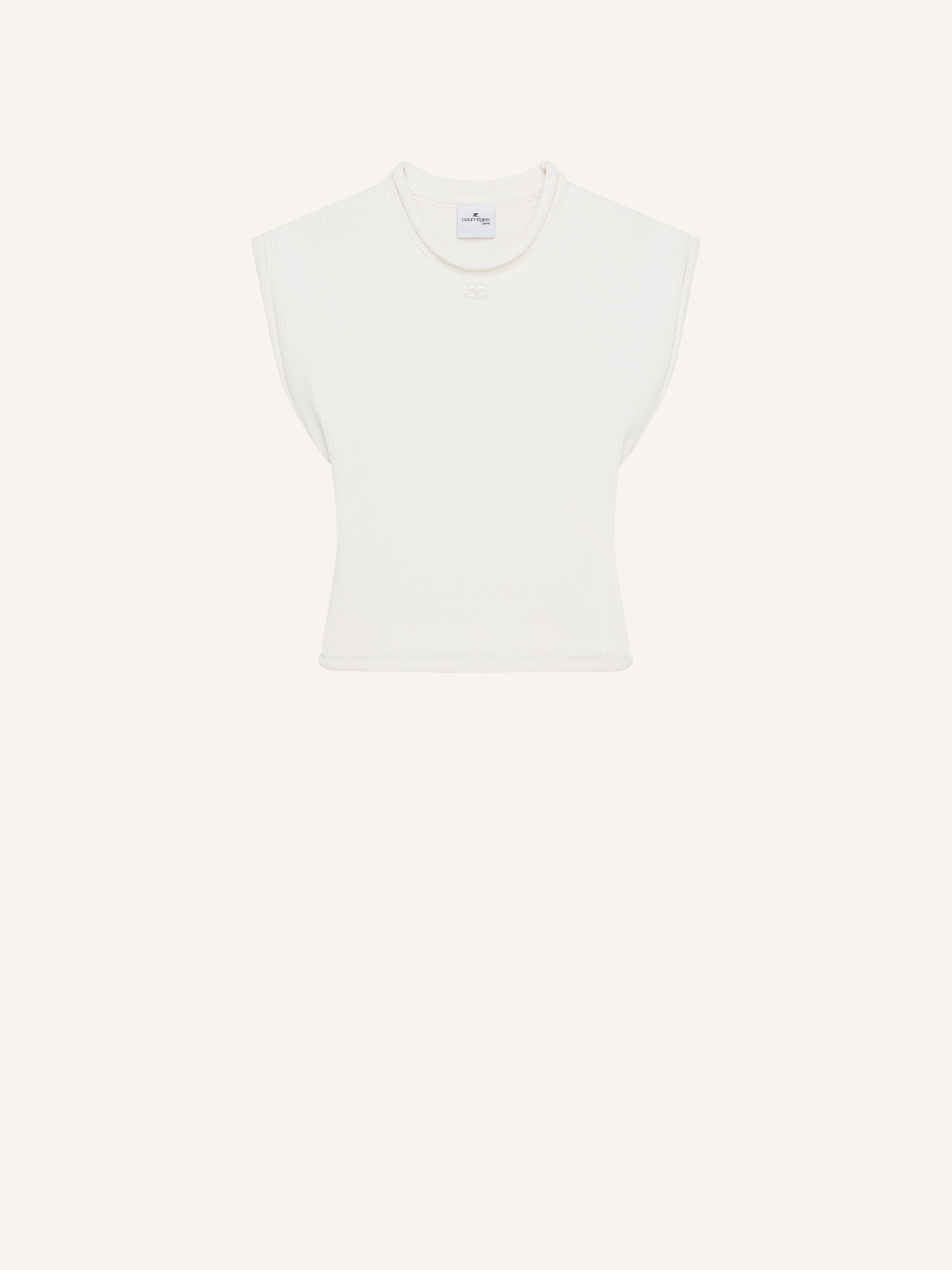 Knit sleeveless short sweater with AC logo embroidered below neckline. The model is 1.77m tall and wears a size S. DETAILS Composition: 67% cotton, 33% polyamide Country of Manufacture: PT SKU: 125MDE116FI00660001 Color: Heritage White
