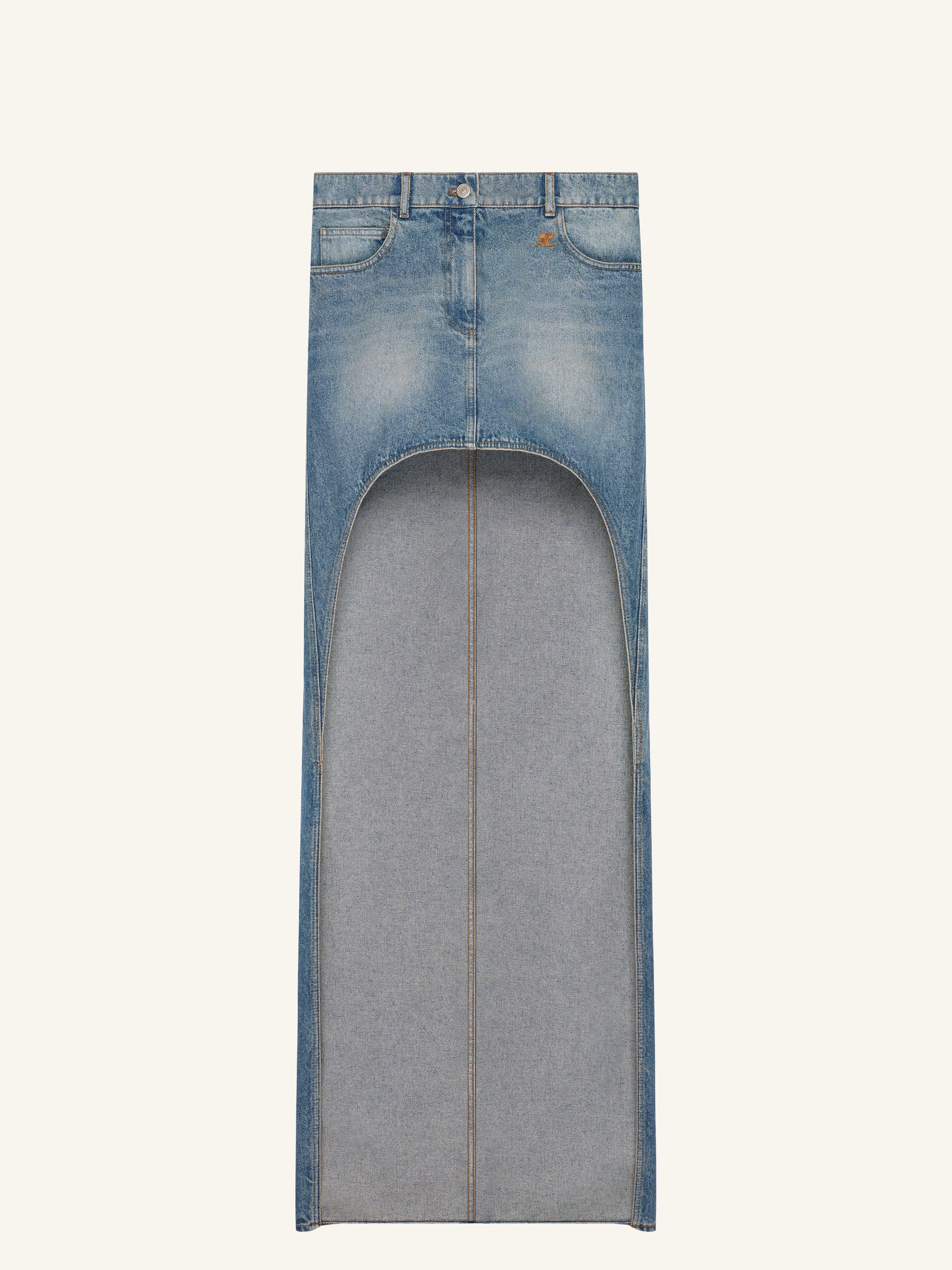 Asymmetrical length denim skirt with two front welt pockets and embroidered AC logo. Each piece is different; bleaching is done by hand and does not allow for an even fading effect. The model is 1.79m and wears a size 26. DETAILS Composition: 100% cotton Country of Manufacture: FR SKU: 126DJU346DE00587055 Color: Denim blue