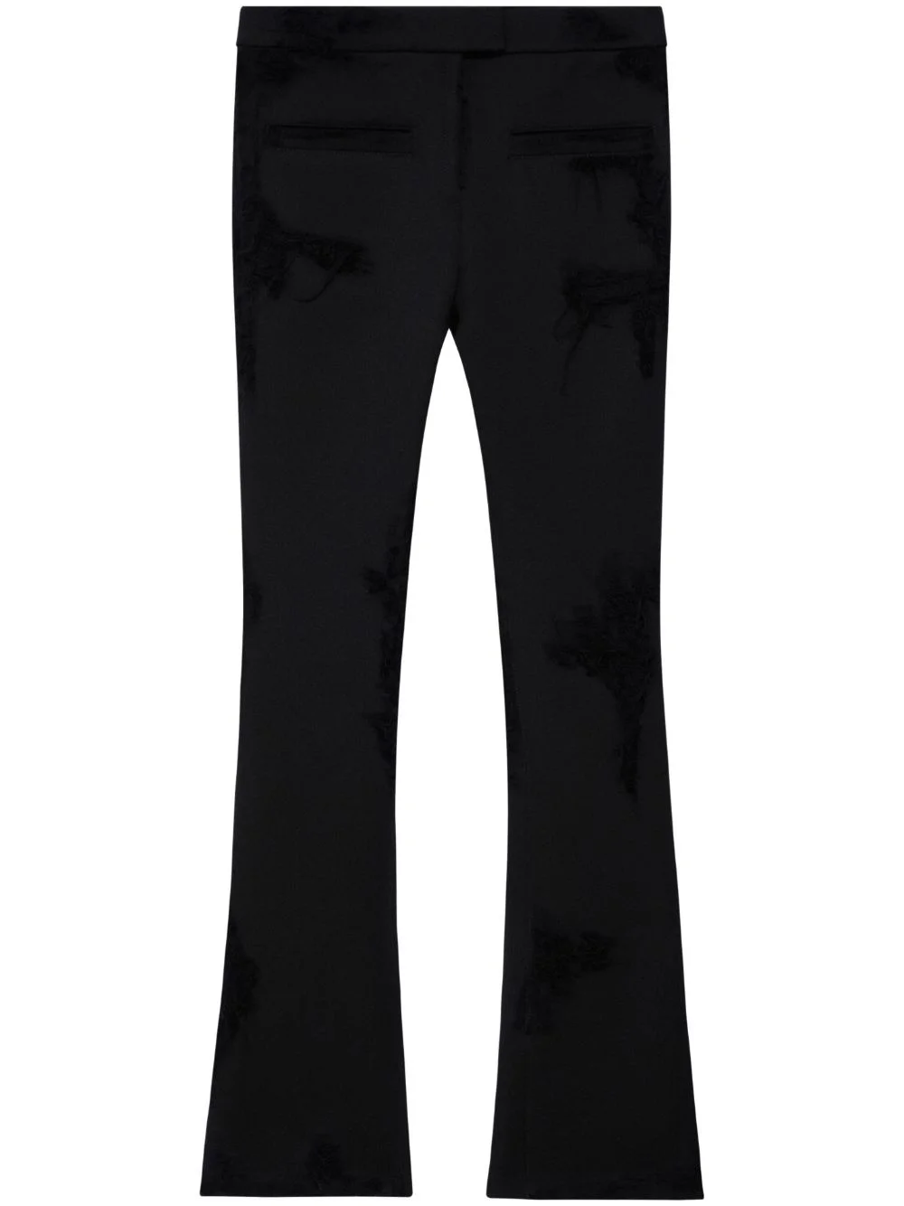 distressed-effect flared trousers Highlights - Black - Concealed front fastening - Two front welt pockets - Distressed effect - Flared - Logo tag - Rear welt pocket Made in France Composition Polyester 83%, Acetate 17% Washing instructions Read Manufacturer Guidelines
