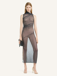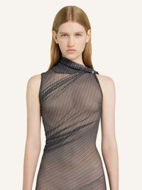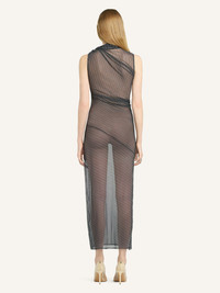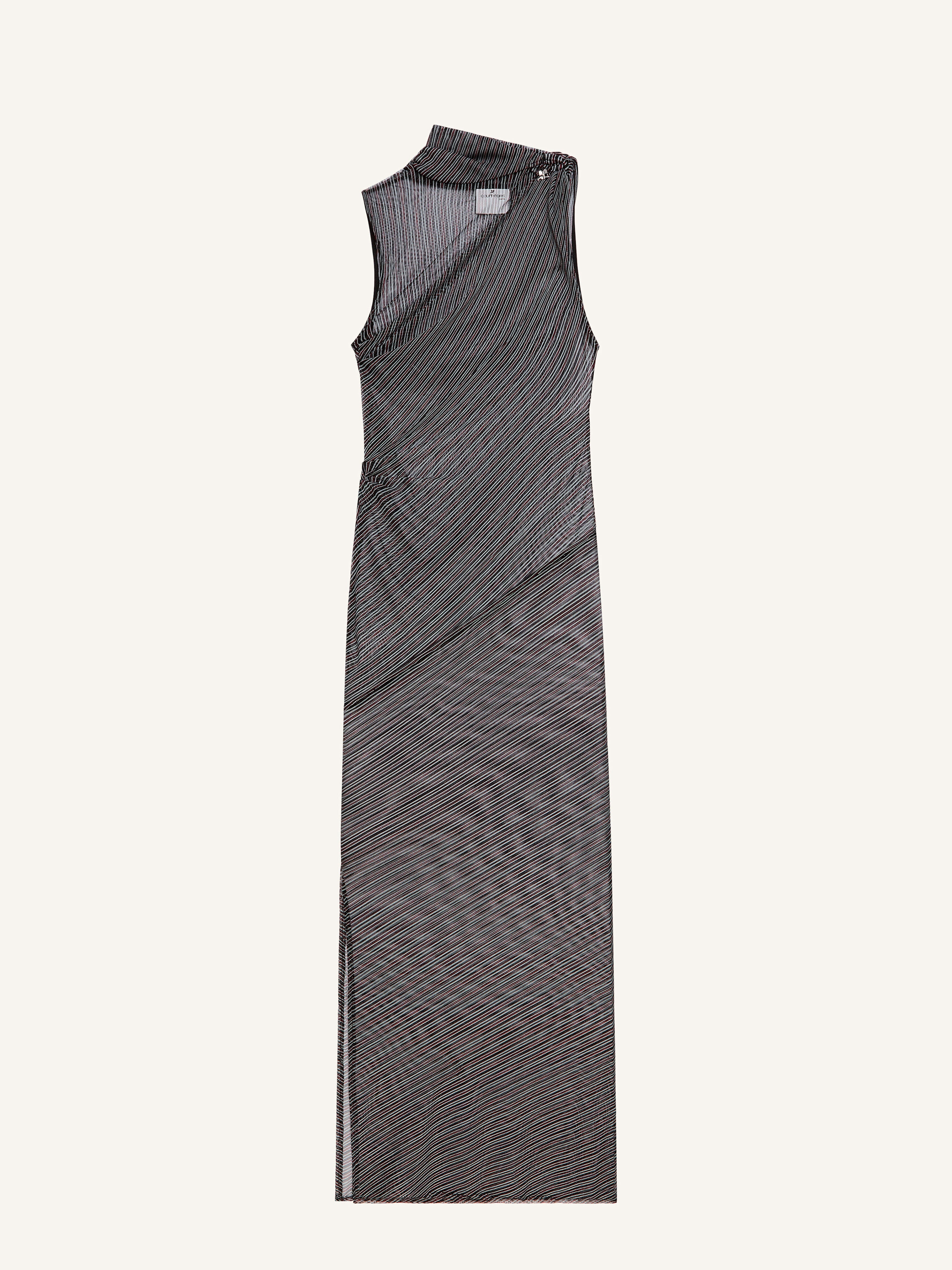 Sheer striped sleeveless long dress with draped shoulder and silver AC logo. Side slit. The model is 1.78m tall and wears a size 36. DETAILS Composition: 100% polyamide Country of Manufacture: IT SKU: 125JRO591PR0099B087 Color: Black / Ruby