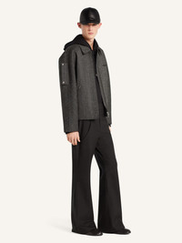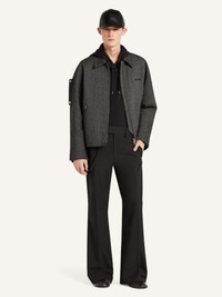 Zipped caviar wool bomber jacket with shirt collar, rib-knit in the back, and side pockets. Embroidered "Courreges" logo at chest and zipped sleeves. This item is unisex. The model is 1.88m tall and wears size M. DETAILS Composition: 100% wool Country of Manufacture: LT SKU: 325CBL308WO01449901 Color: Black/Heritage White