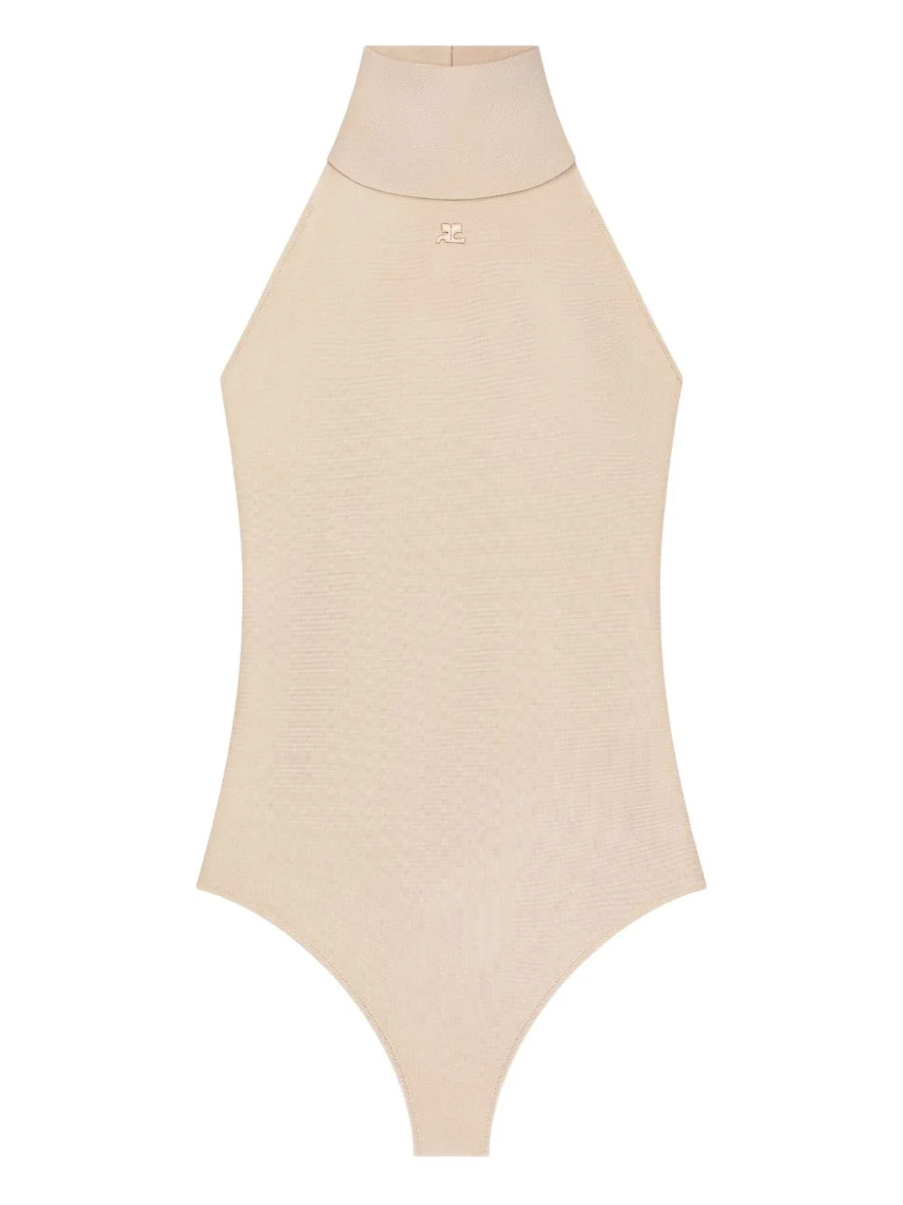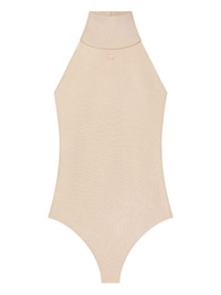 halter-neck jersey bodysuit Highlights - Beige - High neck - Sleeveless - Open back - Ribbed texture Made in Italy Composition Viscose 86%, Polyamide 14% Washing instructions Read Manufacturer Guidelines