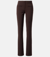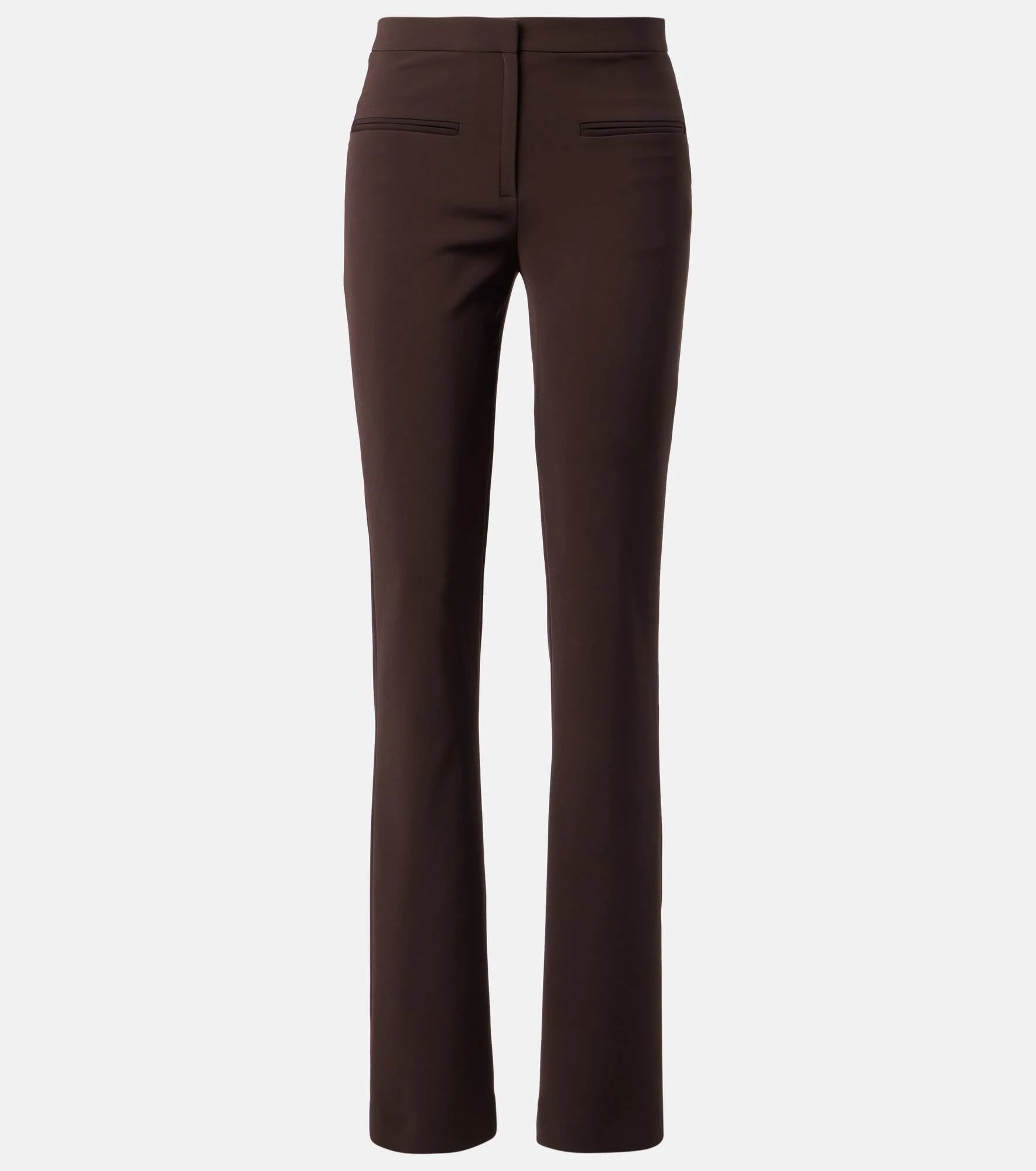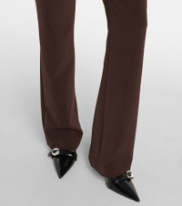 The futurist French fashion house Courreges is rocketing back into orbit with hyper-modern designs rooted in space-age influence. These high-rise pants boast pleats and flared hems. Product Details - Material: 89% polyester, 11% polyurethane - Care instructions: dry clean - Made in Romania - Designer color name: Chocolate - Item color: brown - Pocket lining: 100% cupro - Closure: zip, hook, and button fastening - Pockets: welt pockets - Item number: P01056590 Size & Fit - True to size - Non-stretchy fabric - Flared - The model seen in the picture is 178cm-5'10" and wearing a size FR 36