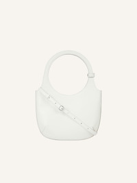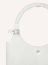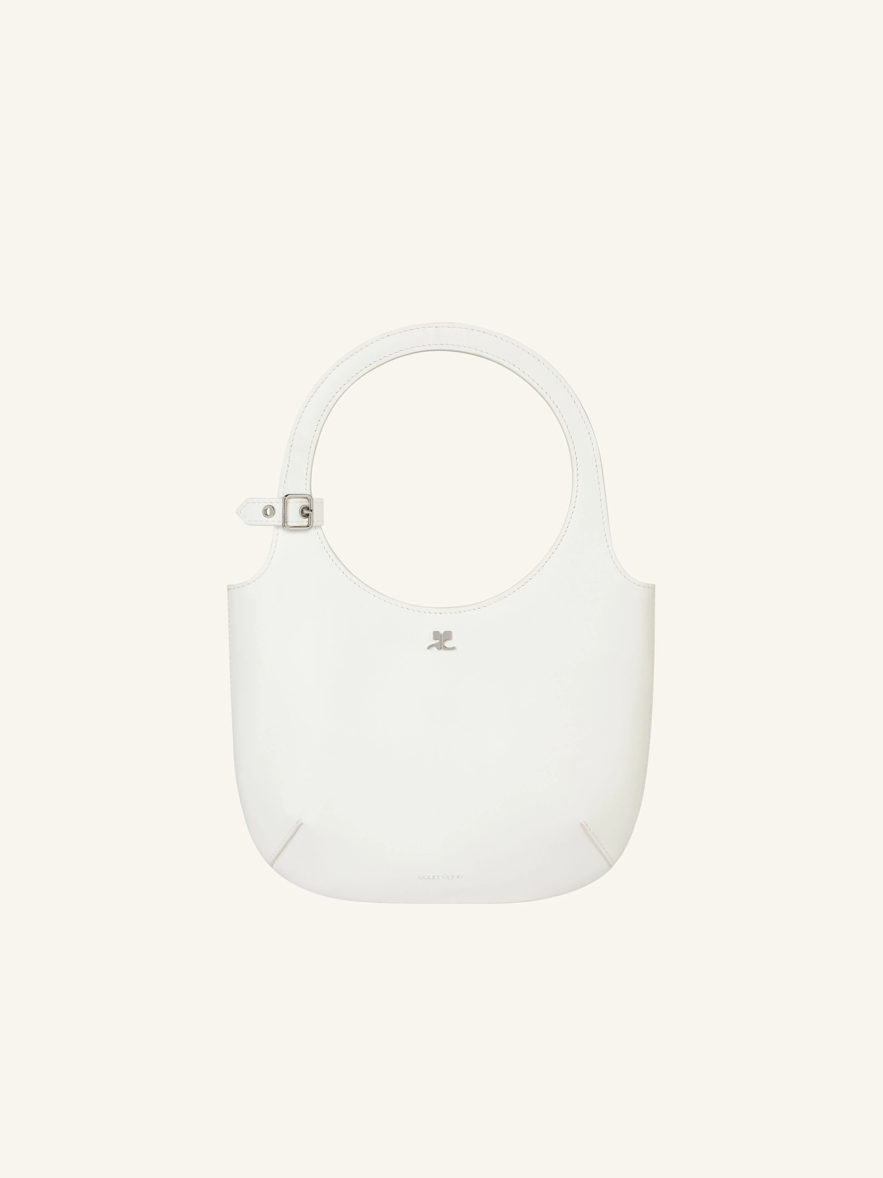 Smooth calf leather Holy bag with magnetic closure and metallic AC logo. Buckle detail on handles and interior pocket. Adjustable and removable shoulder strap with clasps. Embossed "Courreges" logo on front. Length: 19 cm Height: 34 cm Opening width: 24 cm Strap length: 94 cm DETAILS Composition: 100% calf leather Country of Manufacture: IT SKU: 325GSA102CR00650011 Color: Off White