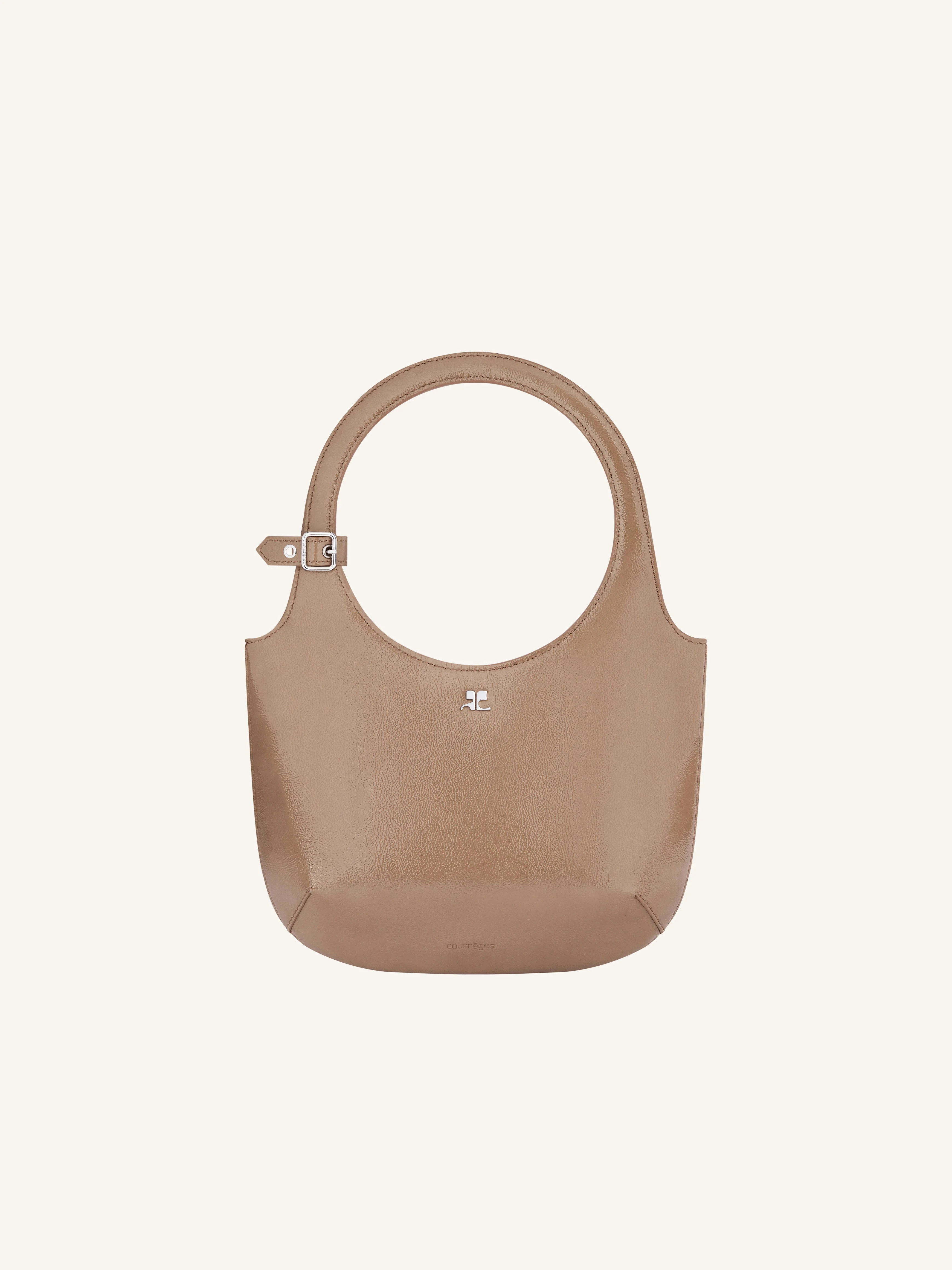 Naplack calf leather Holy bag with magnetic closure and metallic AC logo. Buckle detail on handles and inside pocket. Adjustable and removable shoulder strap with clasps. Embossed "Courreges" logo on front. Length: 19 cm Height: 34 cm Opening width: 24 cm Strap length: 94 cm DETAILS Composition: 100% cow leather Country of Manufacture: IT SKU: 325GSA102CR00431098 Color: Mocha