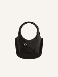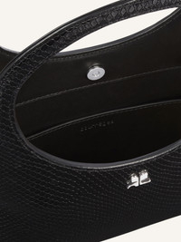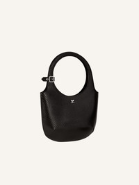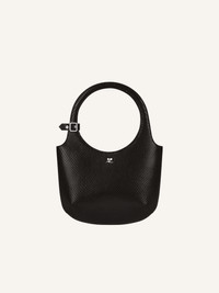 Viper effect leather Holy bag with magnetic closure and metallic AC logo. Buckle detail on handles and interior pocket. Adjustable and removable shoulder strap with clasps. Embossed "Courreges" logo on front. Length: 19 cm Height: 34 cm Opening width: 24 cm Strap length: 94 cm DETAILS Composition: 100% calf leather Country of Manufacture: IT SKU: 325GSA102CV00459999 Color: Black