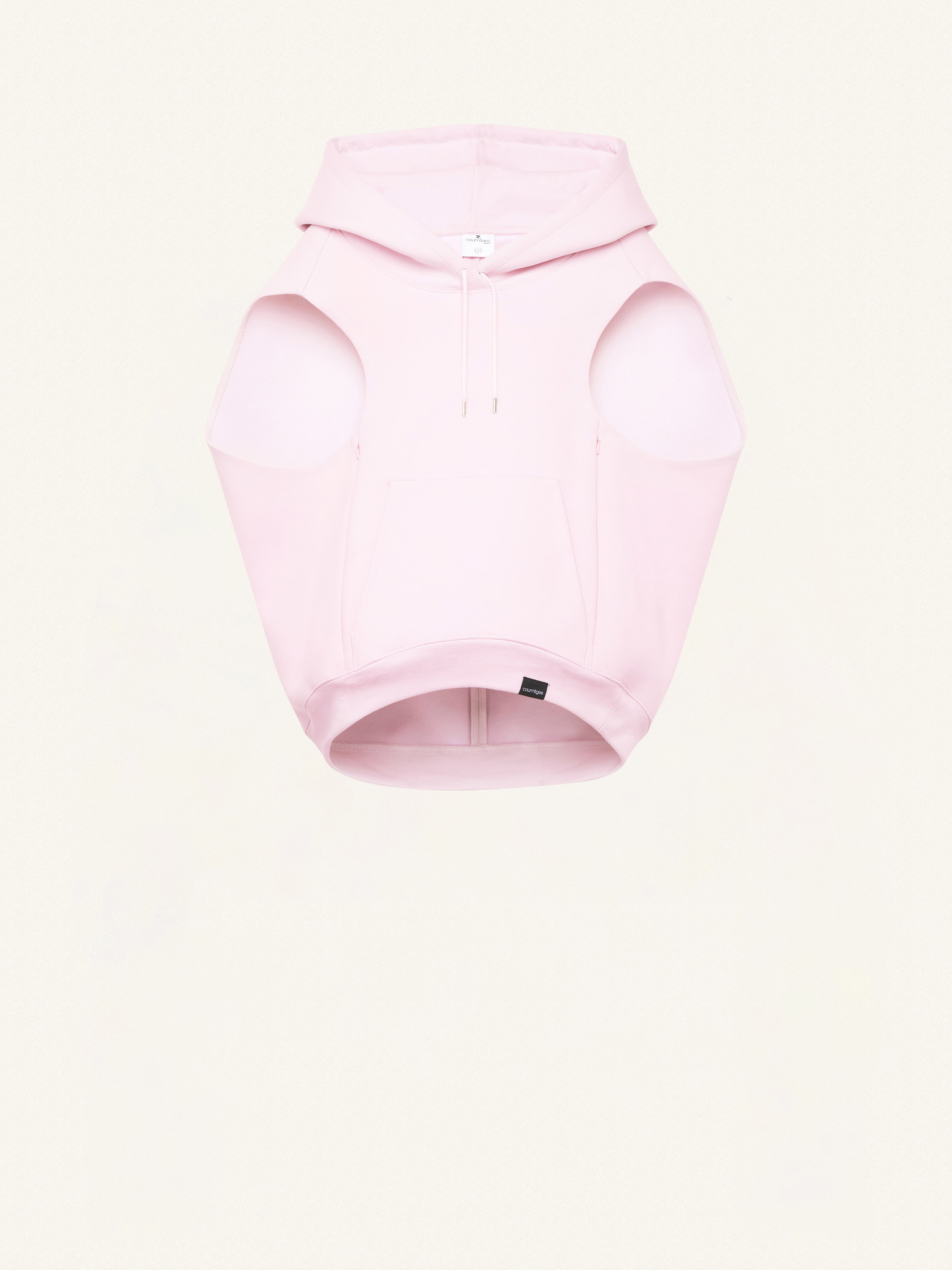This sleeveless oversized hoodie has a cocoon shape and a front pocket. DETAILS Composition: 67% Cotton 16% Polyurethane 15% Polyester 2% Elastane (Fabric 2: 100% Cotton; Fabric 3: 100% organic cotton) Made in: Portugal Color: Powder Pink Code Article : 423JHO023JS0108