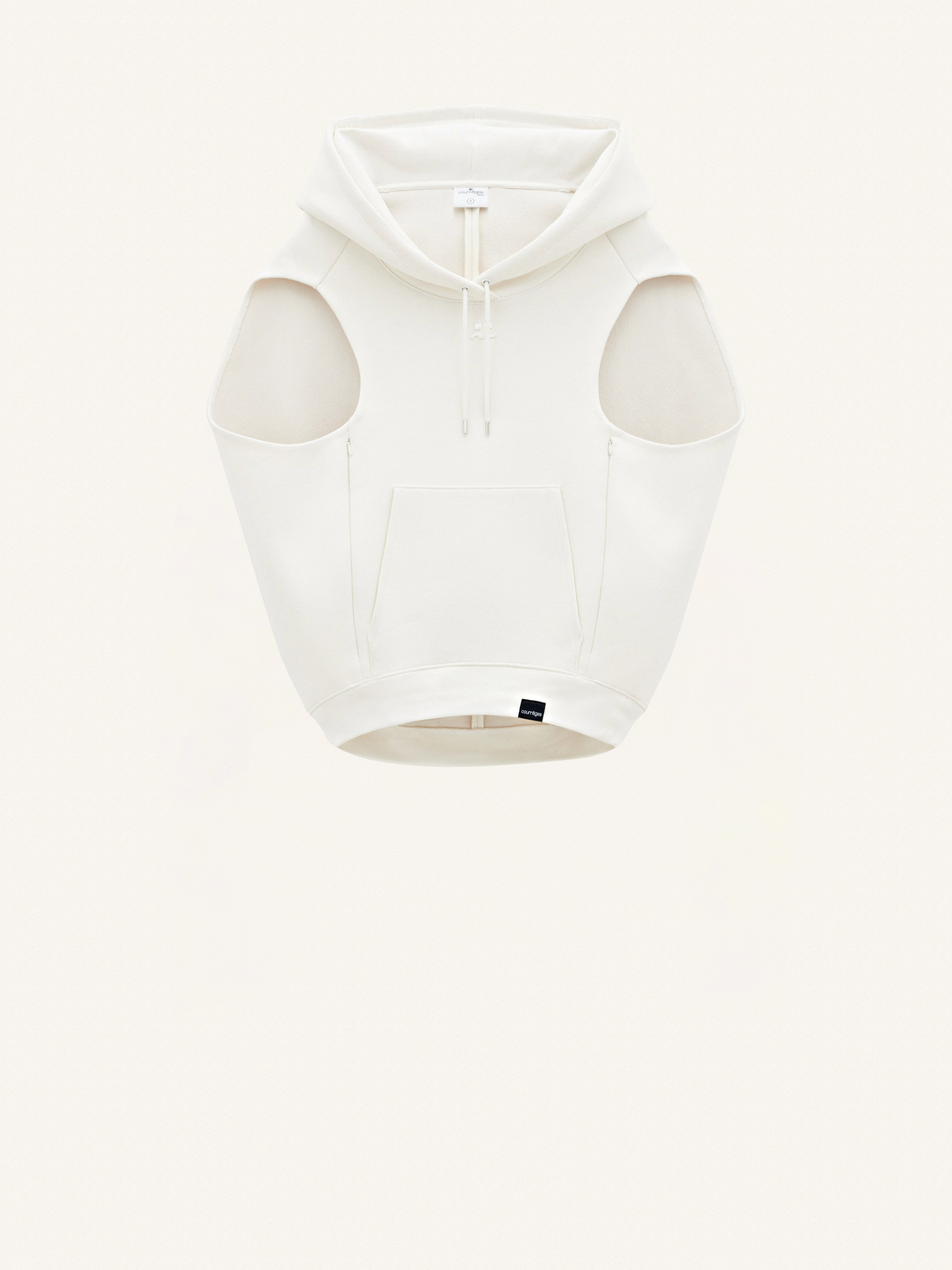 This sleeveless oversized hoodie has a cocoon shape and a front pocket. DETAILS Composition: 67% Cotton 16% Polyurethane 15% Polyester 2% Elastane (Fabric 2: 100% Cotton; Fabric 3: 100% organic cotton) Made in: Portugal Color: Heritage White Code Article : 423JHO023JS0108