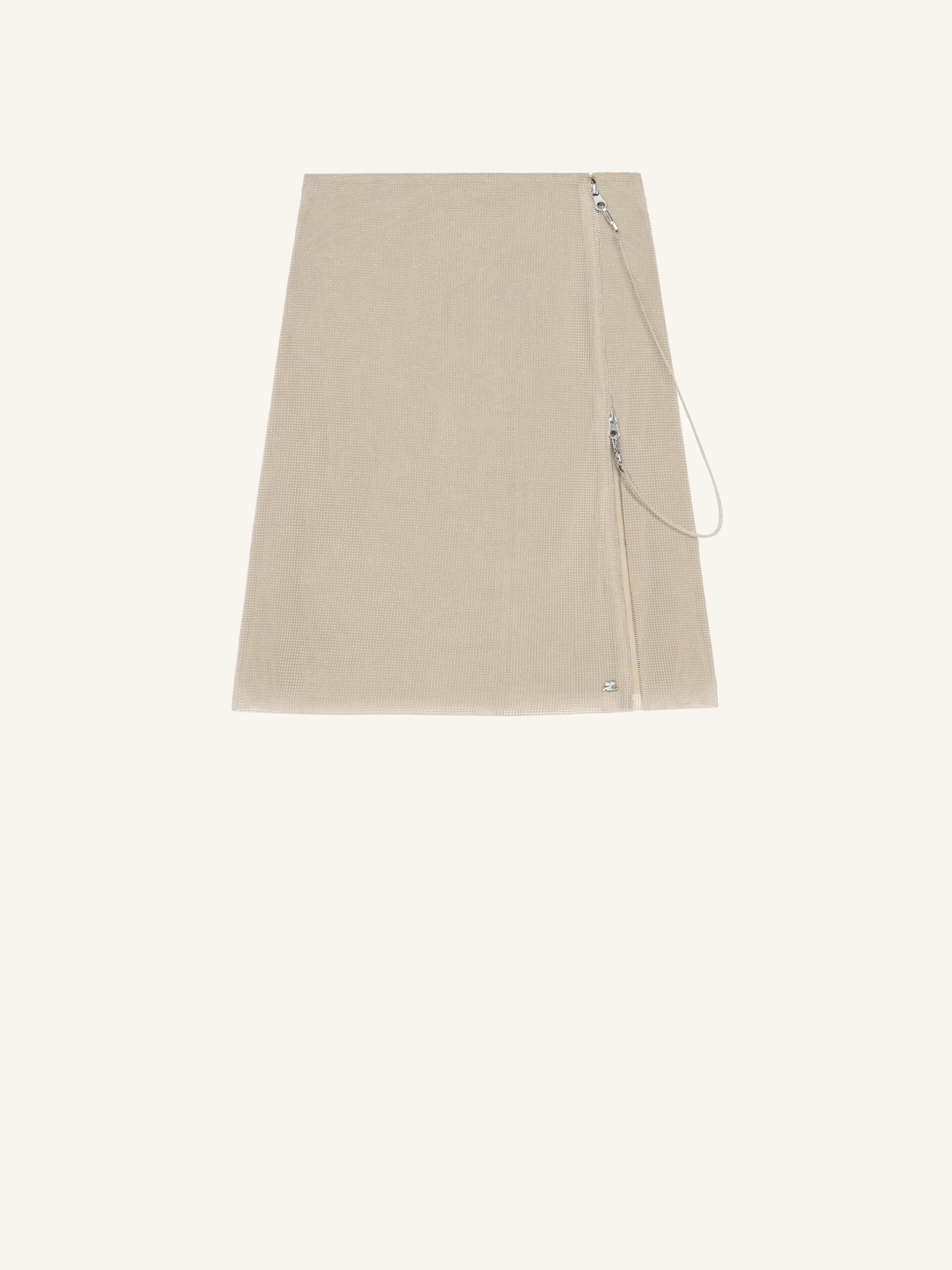 Mid-length transparent skirt with hotfix and zipped opening on the side. Detachable wire and metallic AC logo at the bottom. The model is 1.77m tall and wears a size 36. DETAILS Composition: 47% polyamide, 45% aluminium, 8% elastane Country of Manufacture: IT SKU: 325CJU294EM00039008 Color: Nickel
