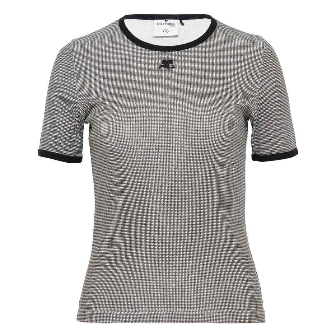 600079365MLT00L / 126JTS017JS0223/00/B217 - Classic houndstooth pattern - Contrasting black trim details - Embroidered Courreges logo - Short sleeves - Round neckline - Premium cotton blend construction - Fitted silhouette Courreges Houndstooth Contrast T-Shirt delivers modern French elegance with architectural precision and timeless pattern play. Crafted from premium cotton blend in classic houndstooth check with contrasting black trim at neckline and sleeves. The structured fit and signature Courreges logo embroidery create a sophisticated foundation piece for contemporary wardrobes.