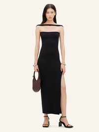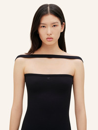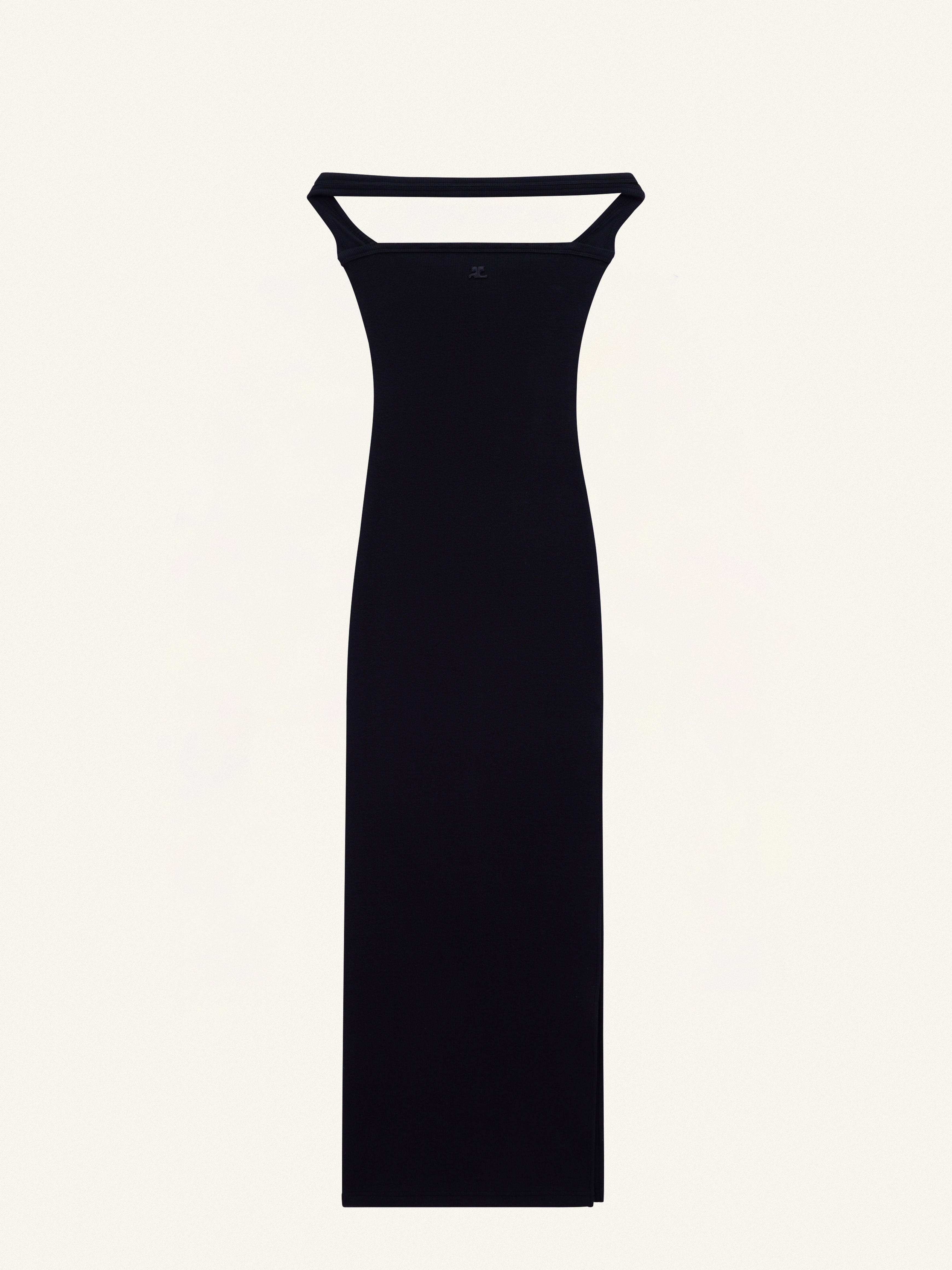 90's rib long bustier dress with side slit. Bare shoulders and embroidered AC logo on front. Straight shape. The model is 1m75 tall and wears a S size. DETAILS Composition: 97% cotton, 3% elastane Country of Manufacture: PT SKU: 224JRO400JS01219999 Color: Black