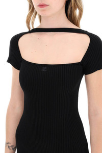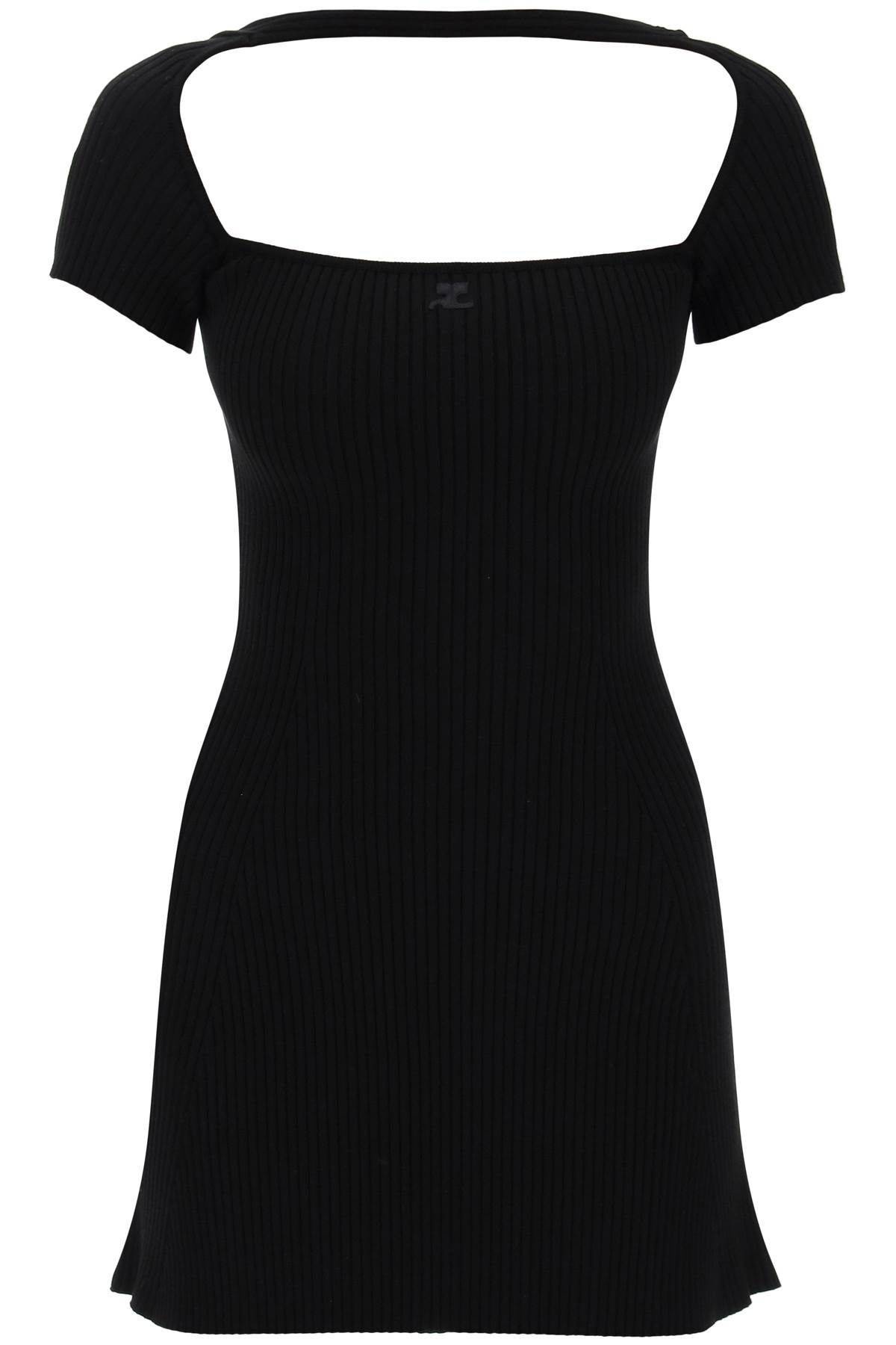 This Courrèges mini dress is made of ribbed jersey and features a short-sleeved design with a ribbon detail on the neckline. It has an embroidered logo in tone on the chest and a flared silhouette. The model is 177 cm tall and wears a size XS. PRODUCT DETAILS Made In: Bulgaria Composizione: 70%VI 30%PL Supplier Code: 224MRO416FI0001 FTA: No Season: SS24