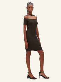 Mini ribbed knit dress. Boat neckline and bare shoulders. Embroidered AC logo on front. Short sleeves. The model is 1m75 tall and wears a S size. DETAILS Composition: 70% viscose, 30% polyester Country of Manufacture: BG SKU: 224MRO416FI00011093 Color: Mud Brown