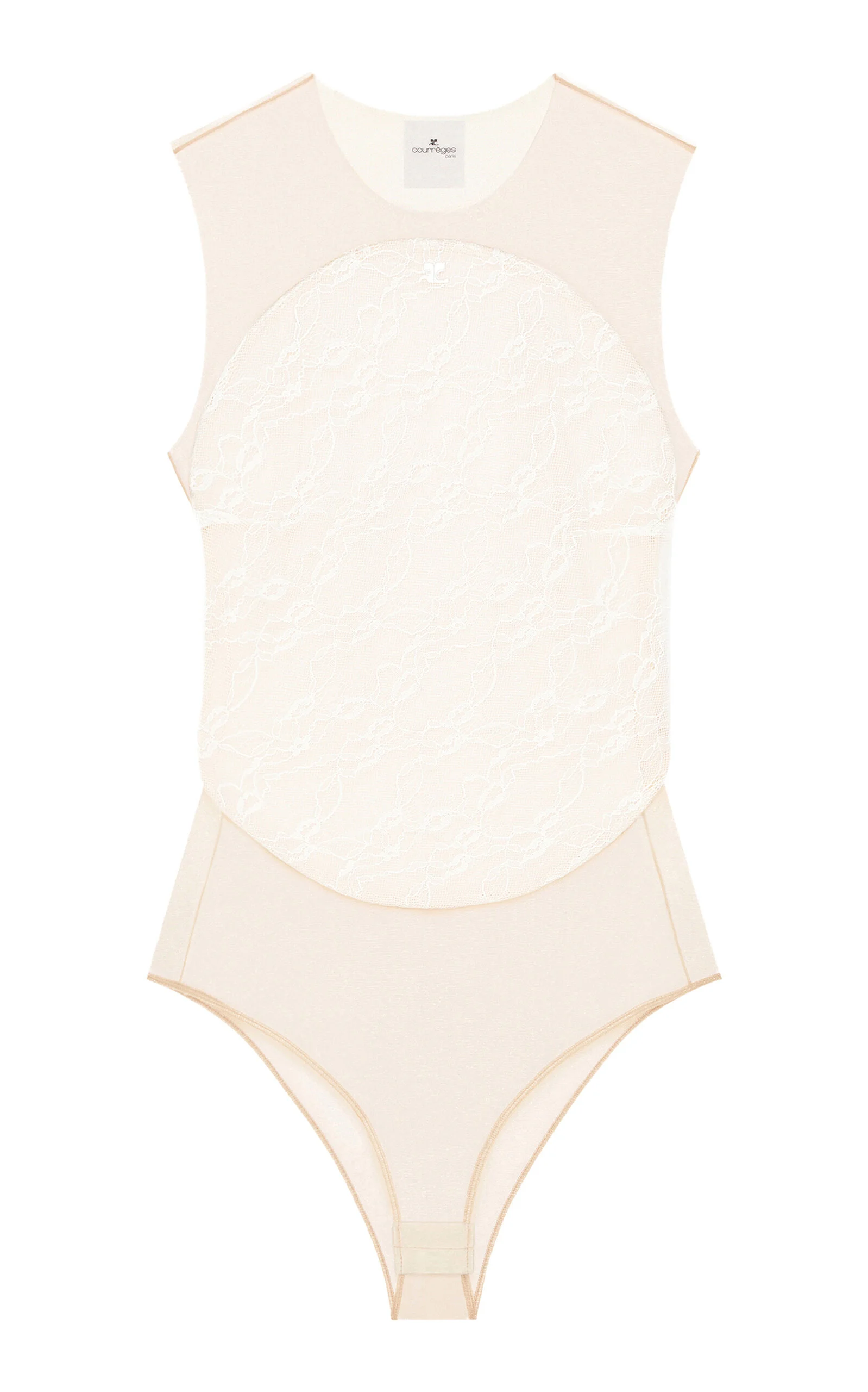 After 12 years alongside Nicolas Ghesquiere and a brief stint at Dior with Raf Simons, Courreges artistic director Nicolas Di Felice has brought the renowned French fashion house back to life. This sleeveless bodysuit is cut from stretch mesh with a sheer lace panel that creates a soft circular contrast through the front. It’s form-fitting with snap closures at the base. Style it with low-rise trousers or layered under a tailored blazer. PRODUCT DETAILS - Pre-Fall '25 - Snap fastenings at base - Composition: 90% polyamide/nylon 10% elastane - Dry clean - Made in France