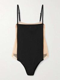 EDITORS'NOTES Since the beginning, COURREGES design premise has been clear; to inspire and empower women. This aptly named 'Illusion' bodysuit is made from a combination of sheer mesh and opaque jersey, so it looks as though it's floating on your frame. You can adjust the straps to your ideal fit. SIZE & FIT Model measurements: - Fits true to size, take your normal size - Designed for a slim fit - Medium brief coverage - Fully adjustable shoulder straps - Lightweight, stretchy fabric - Model is 177cm/ 5'10" and is wearing a size Small - Bust: 85cm/ 33.5" - Waist: 65cm/ 25.5" - Hip: 91cm/ 36" DETAILS & CARE - Black jersey, beige mesh - Pulls on - 78% polyamide, 22% elastane; trim: 82% polyamide, 18% elastane - Machine wash