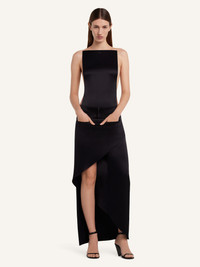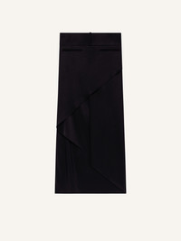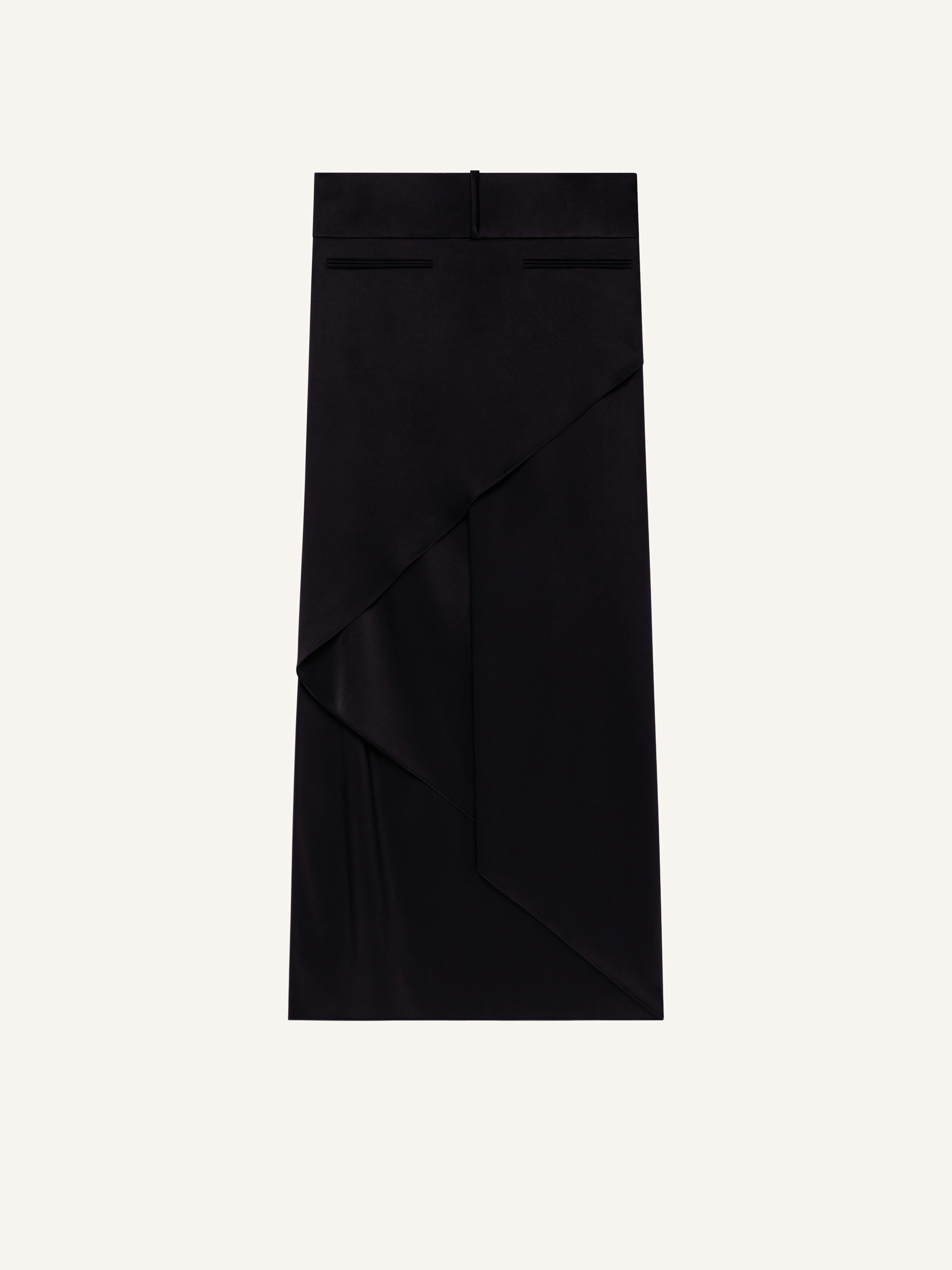 Asymmetrical-length satin skirt with seasonal waistband and welt pockets. Drape between the legs. The model is 1.77m tall and wears a size 36. DETAILS Composition: 83% triacetate , 17% polyester Country of Manufacture: FR SKU: 225CJU246TA00079999 Color: Black
