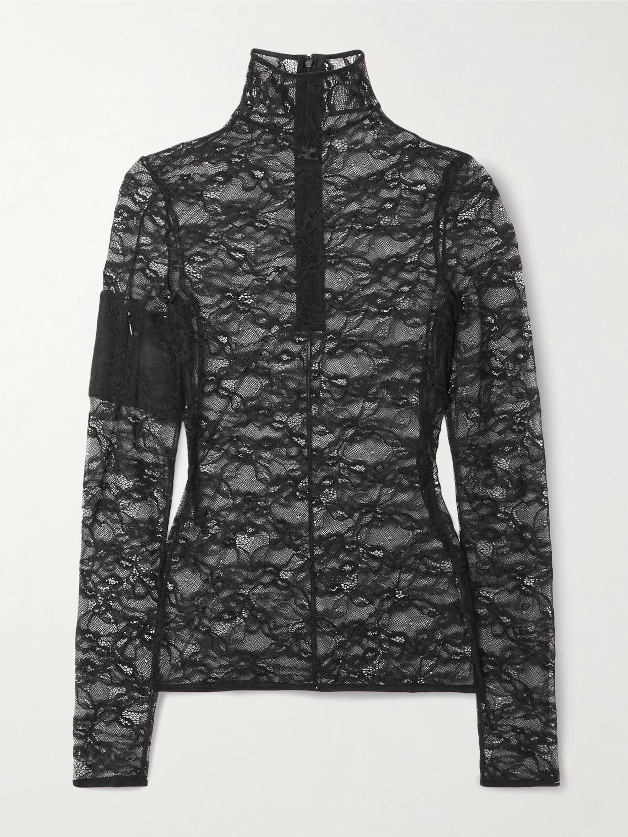 Courreges' mock-neck blouse is made from sheer lace for a close fit. It's embroidered with a tonal logo at the chest and detailed with a sporty, zip-fastening pocket at the sleeve. Wear yours with leather mini skirts and straight-leg pants.