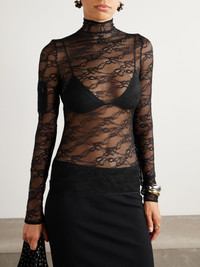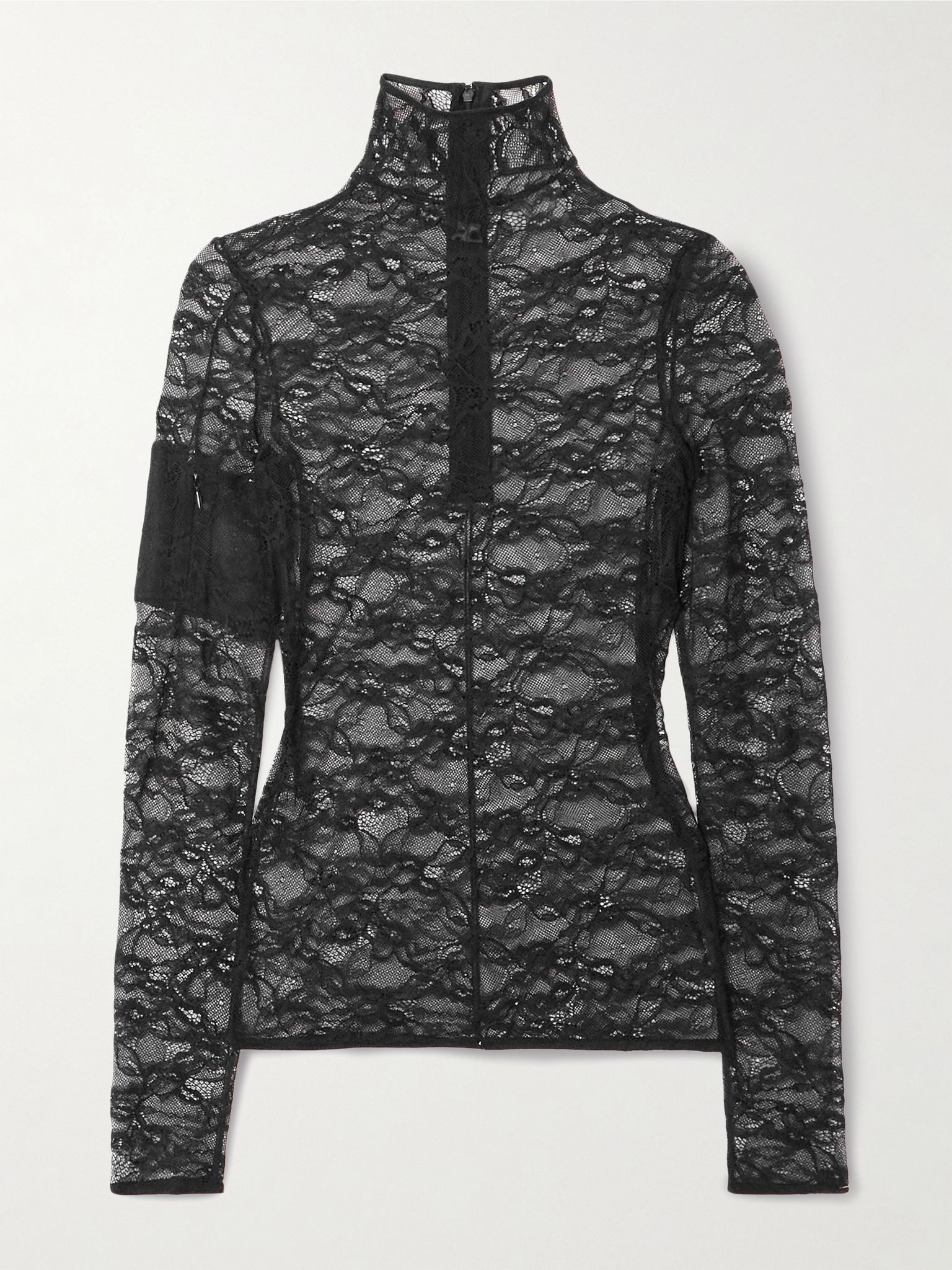Courreges' mock-neck blouse is made from sheer lace for a close fit. It's embroidered with a tonal logo at the chest and detailed with a sporty, zip-fastening pocket at the sleeve. Wear yours with leather mini skirts and straight-leg pants. Size & Fit - Fits true to size, take your normal size - Designed for a close fit - Lightweight, open knit - Model is 177cm/ 5'10" and is wearing a size Small Model measurements: - Bust: 85cm/ 33.5" - Waist: 65cm/ 25.5" - Hip: 91cm/ 36" Details & Care - Black lace - Concealed hook and zip fastening at back - 90% polyamide, 10% elastane - Dry clean