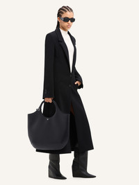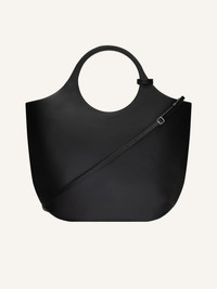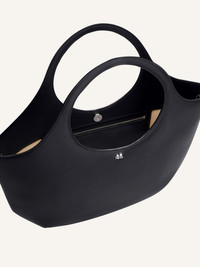 Large smooth leather Holy bag with magnetic closure and metallic AC logo. Embossed Courreges logo on front. Buckle detail on handles. One zipped pocket and two patch pockets inside. Adjustable and removable shoulder strap. Height: 53 cm Width: 48 cm DETAILS Composition: 100% calf leather Country of Manufacture: IT SKU: 224GSA103CR00659999 Color: Black