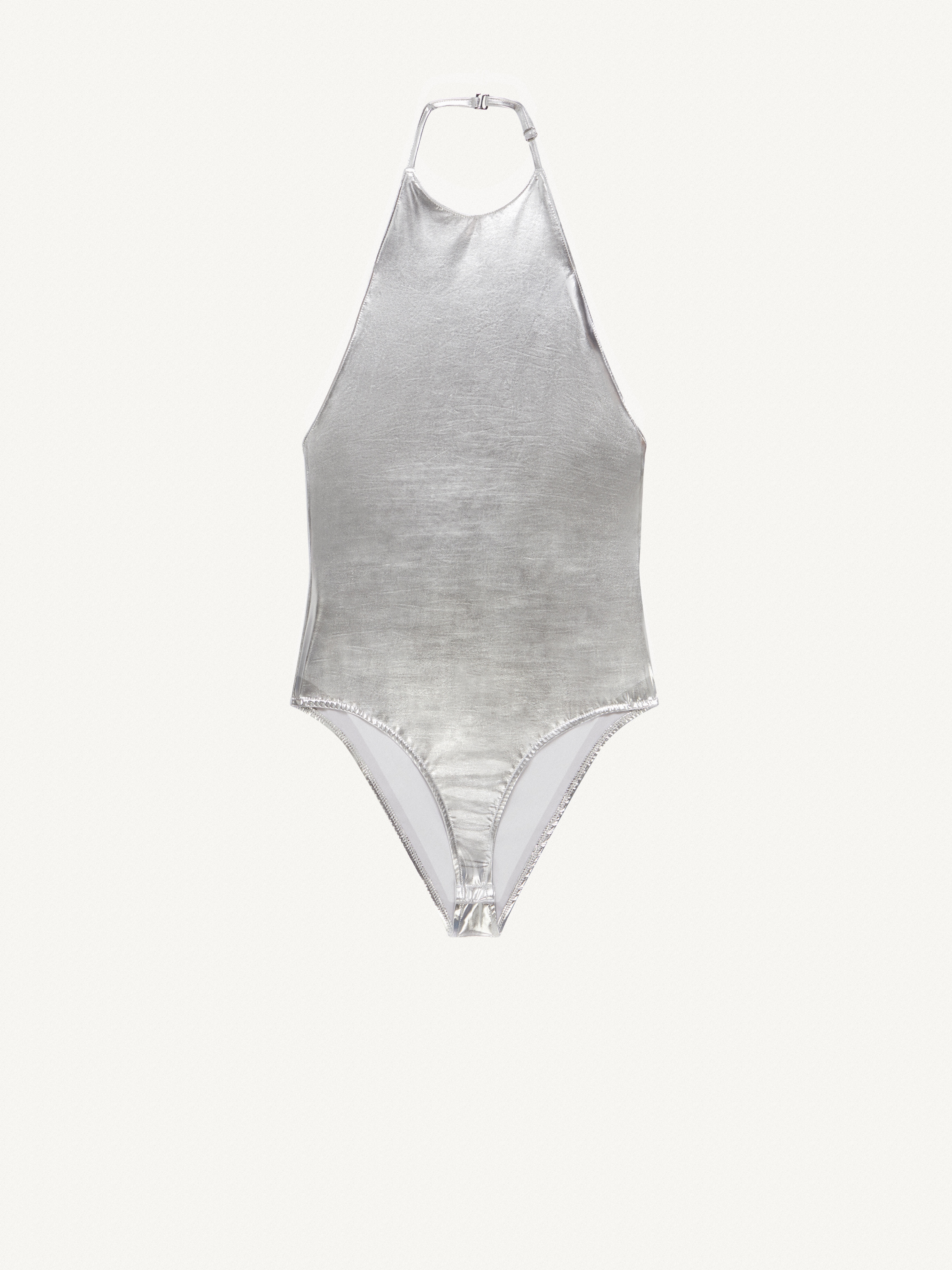 Silver jersey sleeveless bodysuit with embroidered logo and lingerie strap. DETAILS Composition: 70% POLYAMIDE/NYLON 30% ELASTHANE Details: 70% polyamid/nylon 30% elasthane Country of manufacture: Tunisia Color: Argent Item code: 223JBD046JS00859000