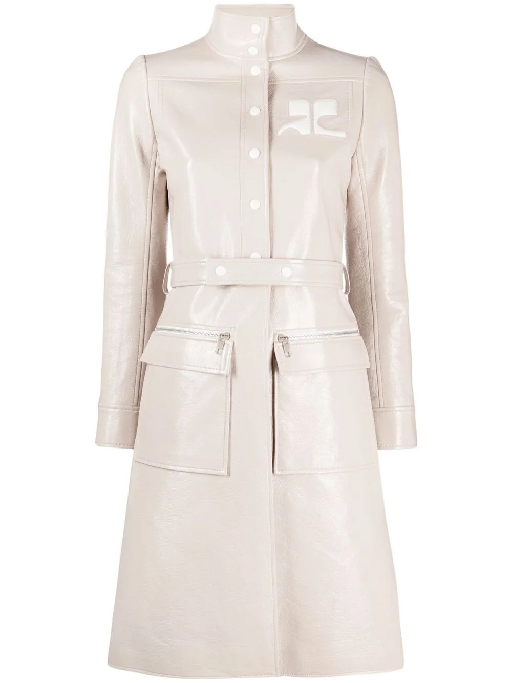 logo-applique vinyl trench coat Highlights - Cream - Funnel neck - Front press-stud fastening - Long sleeves - Belted waist - Front zip fastening pockets - Two front flap pockets - Mid-length - Logo patch to the front Imported Composition Outer: Cotton 88%, Polyurethane 10%, Spandex/Elastane 2% Lining: Cupro 100% SIZE & FIT Model measurements Height 5 ft 10 in(1.77 m) Bust/Chest 32.28 in(82 cm) Hips 35.03 in(89 cm) Waist 25.19 in(64 cm) Measurement SLEEVE LENGTH 23.62 in(60 cm) Shoulder Width 14.17 in(36 cm) LENGTH 38.97 in(99 cm) WAIST 29.13 in(74 cm) BUST 33.07 in(84 cm) FittingInformation This piece fits small – you might want to get one size up Designed for a close fit at the bust and waist, but loose at the hip Made with a mid-weight fabric