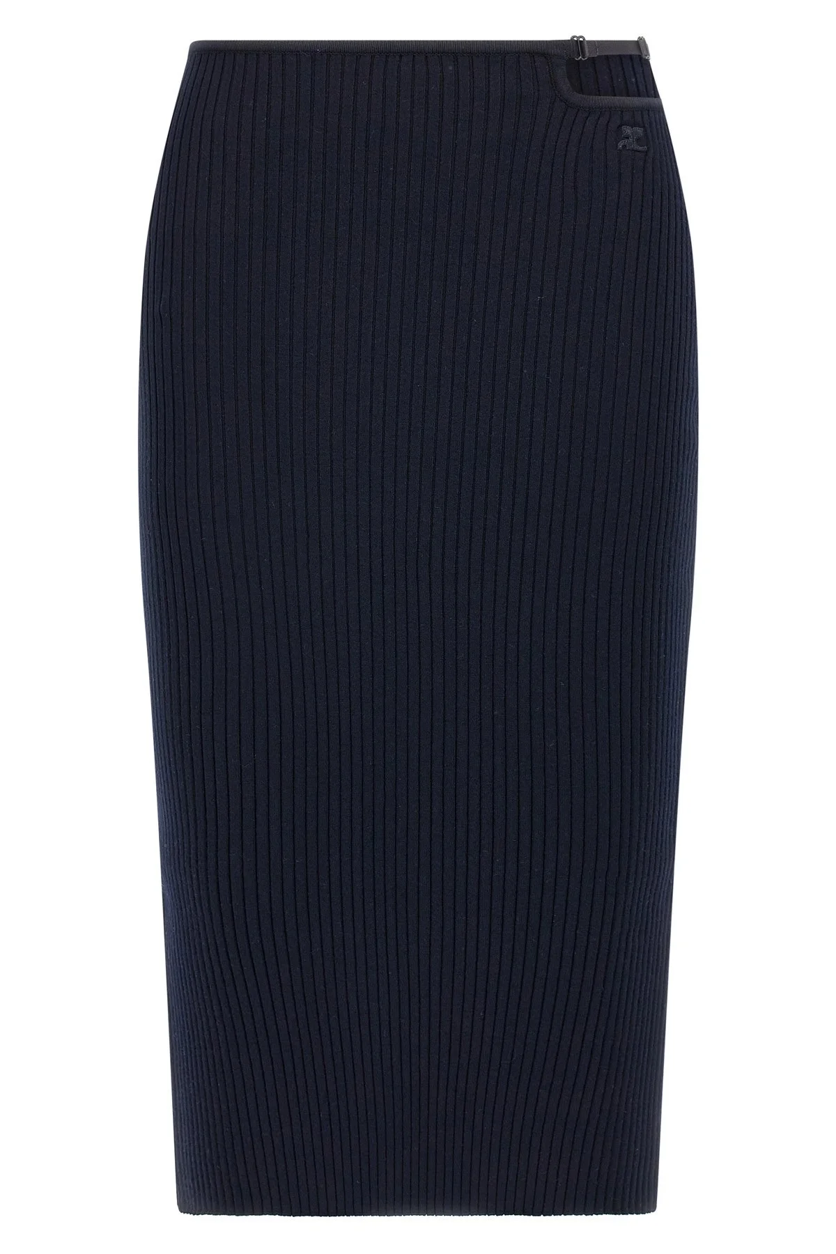 cod. 125MJU232FI00017075 'Loop Rib knit' ribbed knit midi skirt, cut-out detail at the waist with adjustable strap, tonal logo patch. Color: Blue Size & Fit: True to size fit Composition: 70% viscose, 30% polyester Made in: Bulgaria