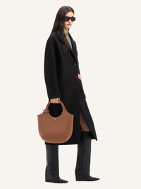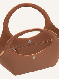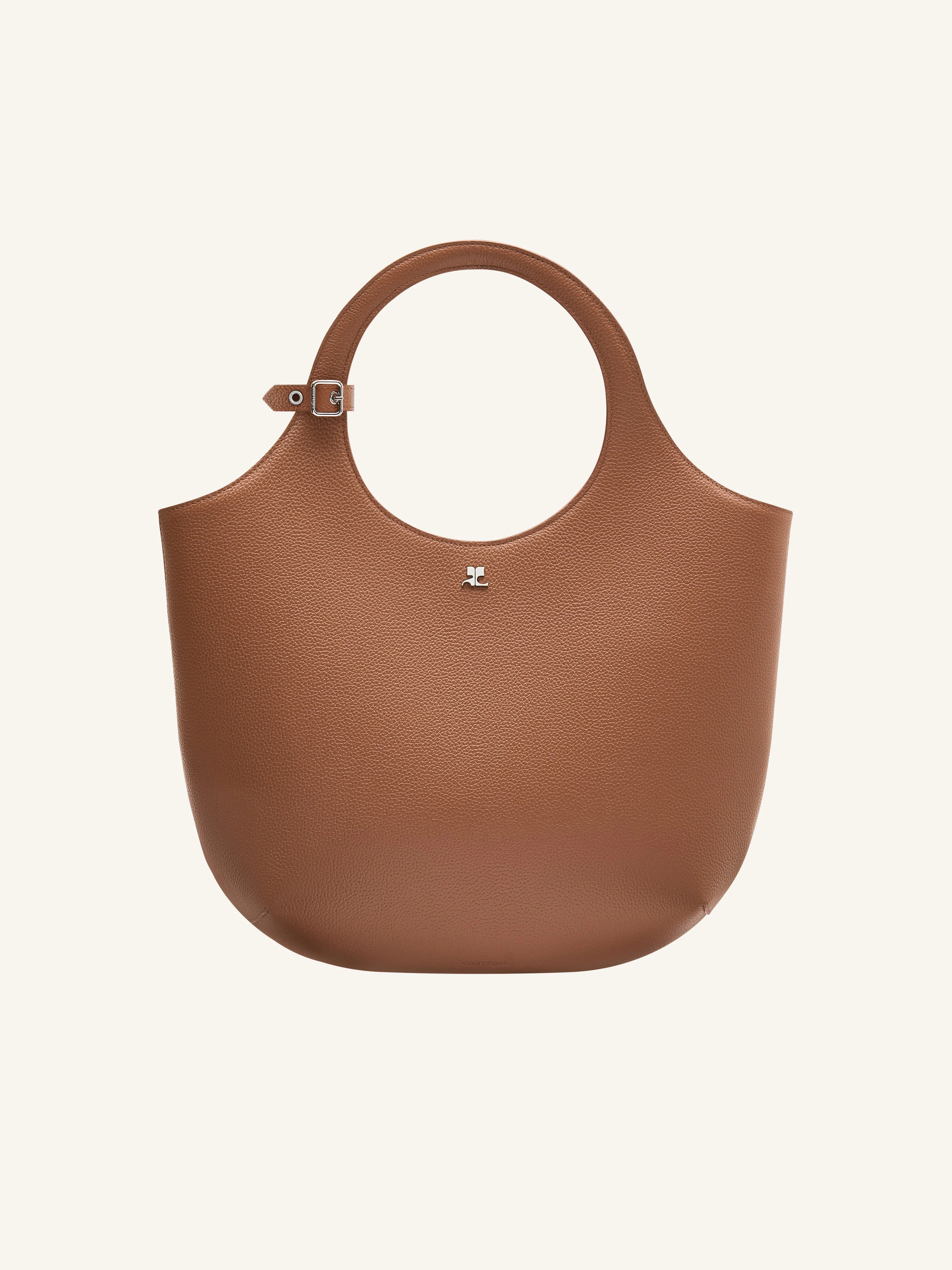 Medium-sized grained leather Holy bag with magnetic closure and metallic AC logo. Buckle detail on handles and interior pocket. Adjustable and removable shoulder strap. Embossed Courreges logo on front. Length: 39 cm Height: 45 cm DETAILS Composition: 100% calfskin Country of Manufacture: IT SKU: 324GSA116CV00161964 Color: Toffee