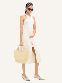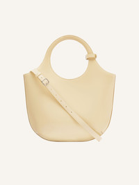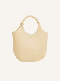 Medium-sized iced leather Holy bag with magnetic closure and metallic AC logo. Buckle detail on handles and interior pocket. Adjustable and removable shoulder strap. Embossed Courreges logo on front. Length: 39 cm Height: 45 cm DETAILS Composition: 100% calf leather Country of Manufacture: IT SKU: 324GSA116CV00332023 Color: Soft Butter