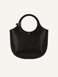 Medium-sized viper effect leather Holy bag with magnetic closure and metallic AC logo. Buckle detail on handles and inside zipped pocket. Adjustable and removable shoulder strap with clasps. Embossed "Courreges" logo on front. Length: 38 cm Height: 45 cm Opening width: 39 cm Strap length: 104 cm DETAILS Composition: 100% calf leather Country of Manufacture: IT SKU: 325GSA116CV00459999 Color: Black