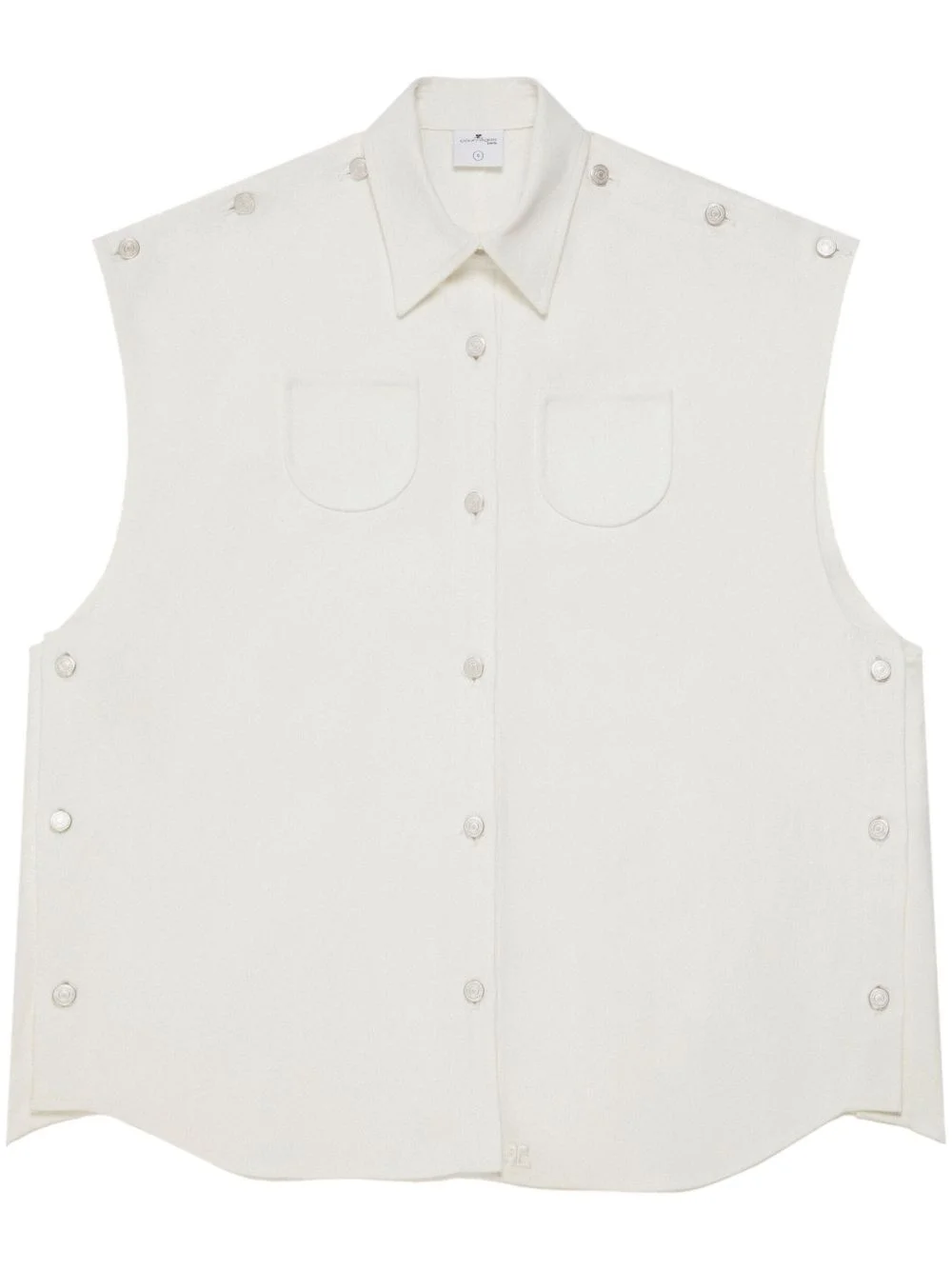 Mega-Styling denim shirt Courreges' exaggerated take on classics is evidenced with this shirt. Cut from denim to a boxy silhouette, it’s adorned with silver-tone buttons at the placket, shoulders and side for custom styling. Highlights - White - Cotton - Denim - Embroidered logo to the front - Decorative button detailing - Pointed flat collar - Front button fastening - Sleeveless - Two chest patch pockets - Curved hem Imported Composition Cotton 100%, Polyester 100% Lining: Cotton 100% Washing instructions Read Manufacturer Guidelines